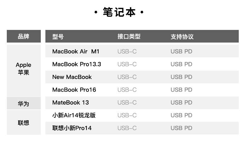 笔电端目前充电头网评测室共有7台笔记本电脑,分为苹果、华为、联想三个品牌,包括新增的M1处理器MacBook Air。这些笔电都有一个共同点,均配备USB-C物理充电接口且支持USB PD快速充电,这里面充电功率最高的当初MacBook Pro 16了,支持百瓦快充功率,原装96W充电器也是苹果首款百瓦级别的USB PD大功率充电器。