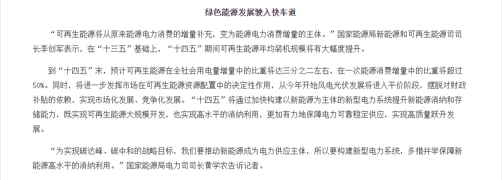 除了新国标,还有我国十四五规划的发布,其中关于绿色发展就与能源安全有关。光明日报解读:“ 我们要推动新能源成为电力供应主体”。