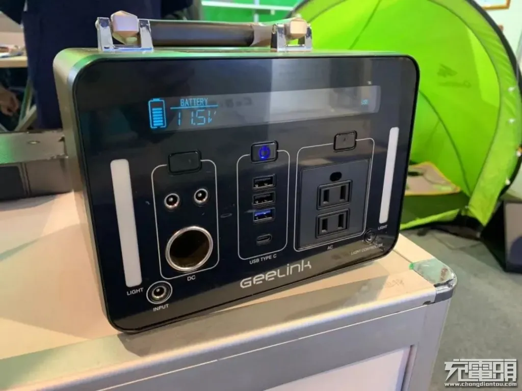 GeeLink这款储能电源总能量为500Wh,的机身为铝合金材质,顶部带把手设计。产品正面设有一块长条形的显示屏。两侧各有一个LED照明灯。三组接口分别通过三个开关按键控制,其中两个AC接口输出电压为110V,持续功率250W。