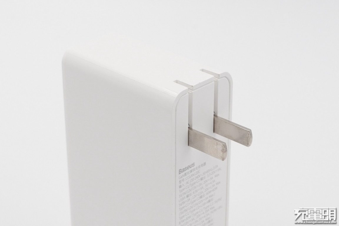 插脚方面倍思120W氮化镓充电器采用了可折叠插脚,相比起固定插脚,折叠插脚在外出时可将插脚收纳进壳体内方便用户出门使用,充电器放置在背包行李箱内能避免与其他物品互相刮蹭。