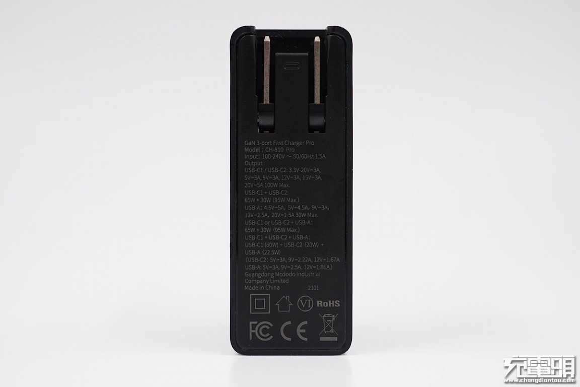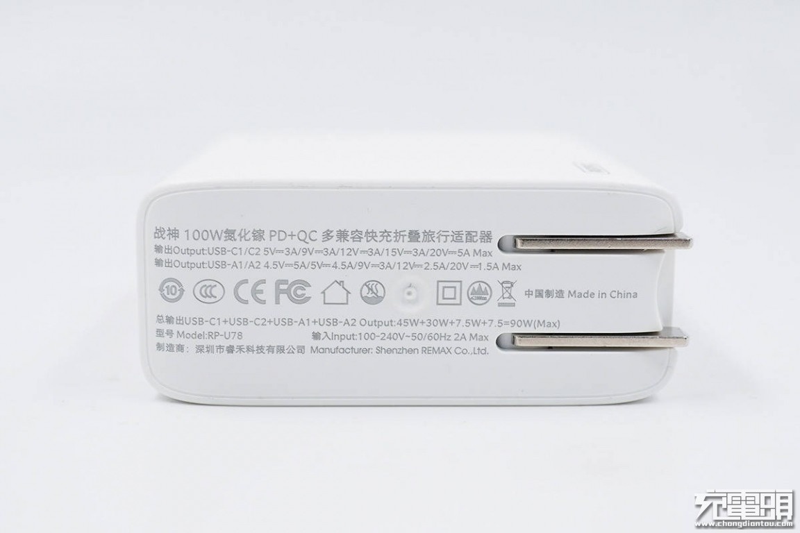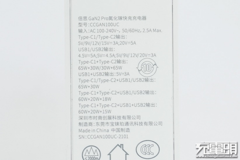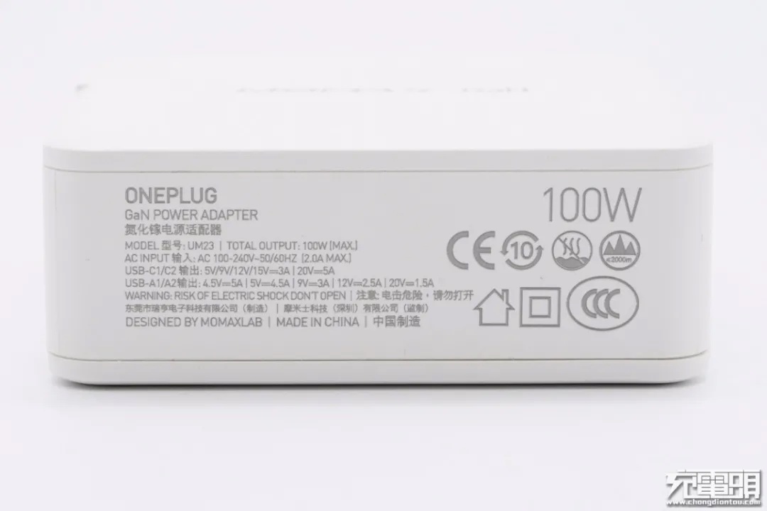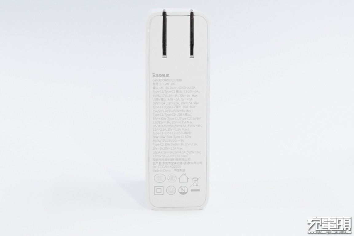 充电器底盖部分密密麻麻标注了性能参数,十分丰富细致,考虑到图片被压缩太小无法看清,小编将所有数据都打出来。