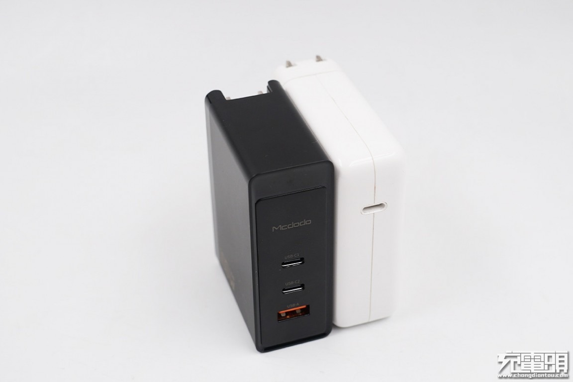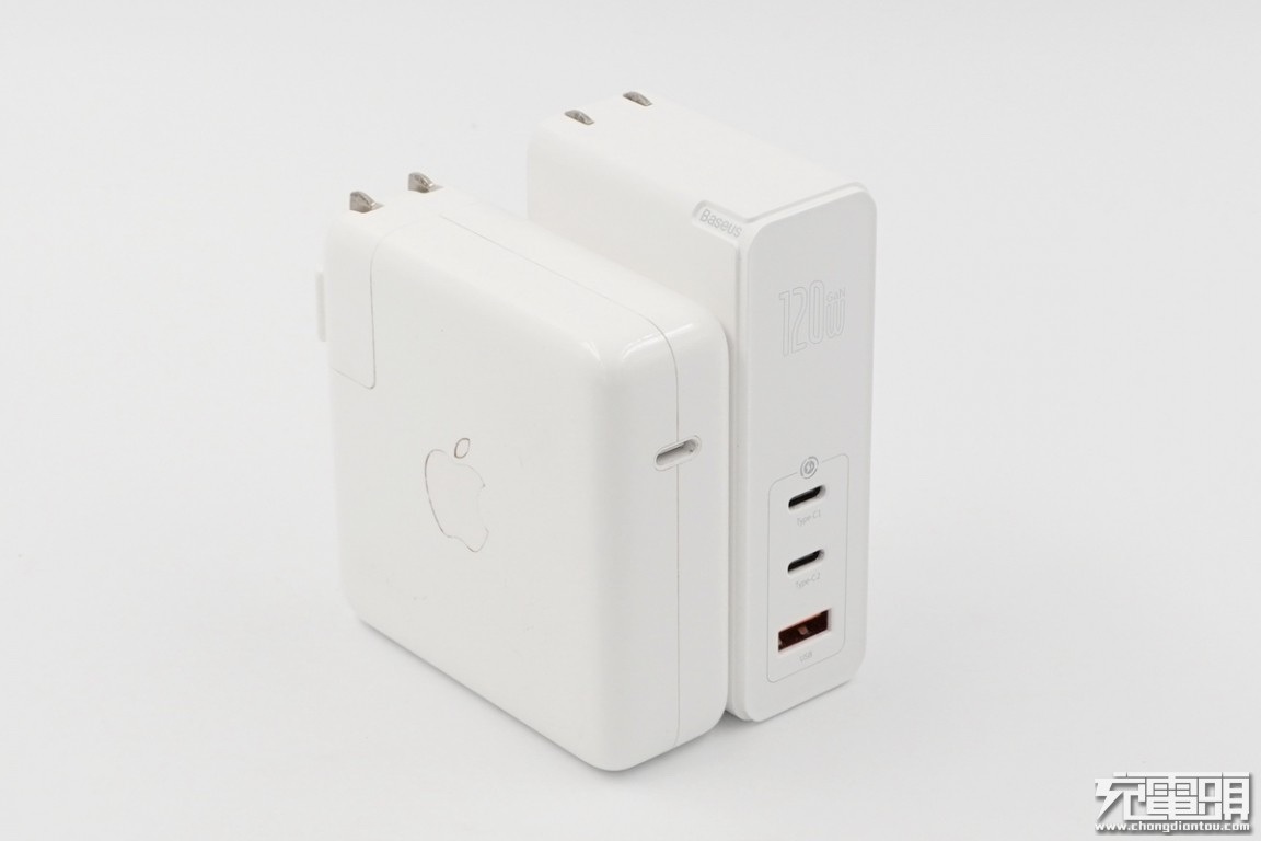 倍思120W氮化镓充电器单独来看无法直观地感知尺寸有多大,小编拿出苹果96W单口充电器放在一起,可以看到尽管倍思拥有更高的功率和更多的输出接口,他们的体积也接近。