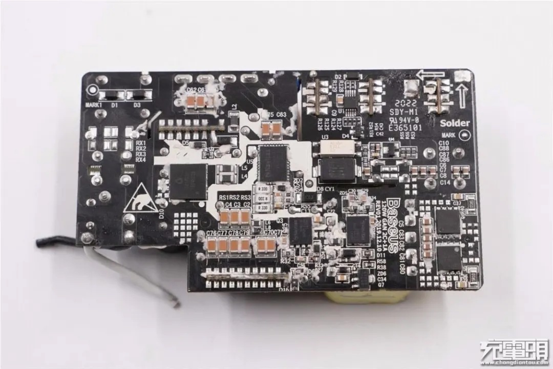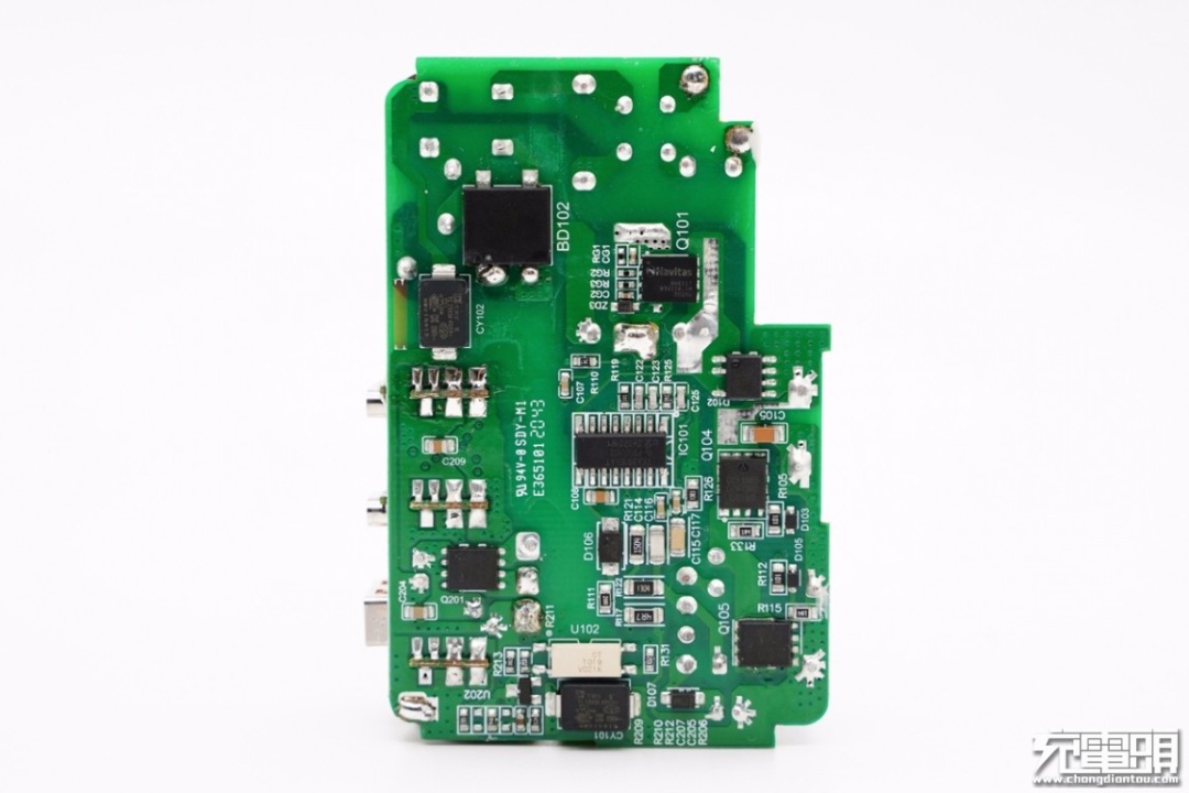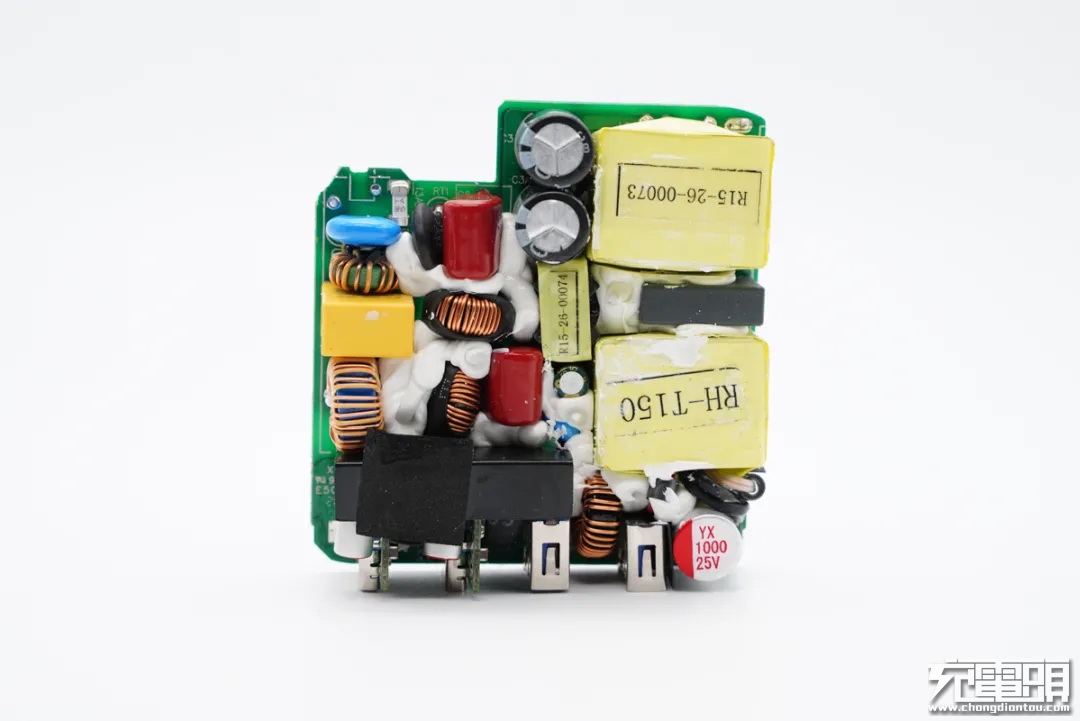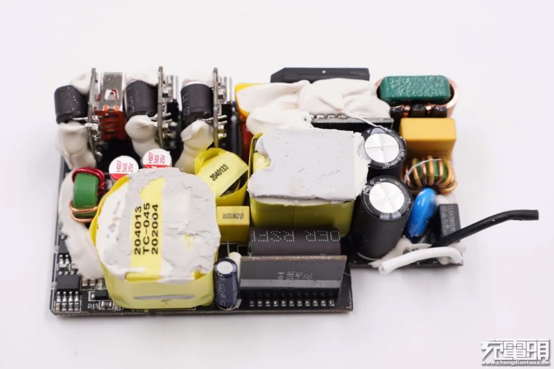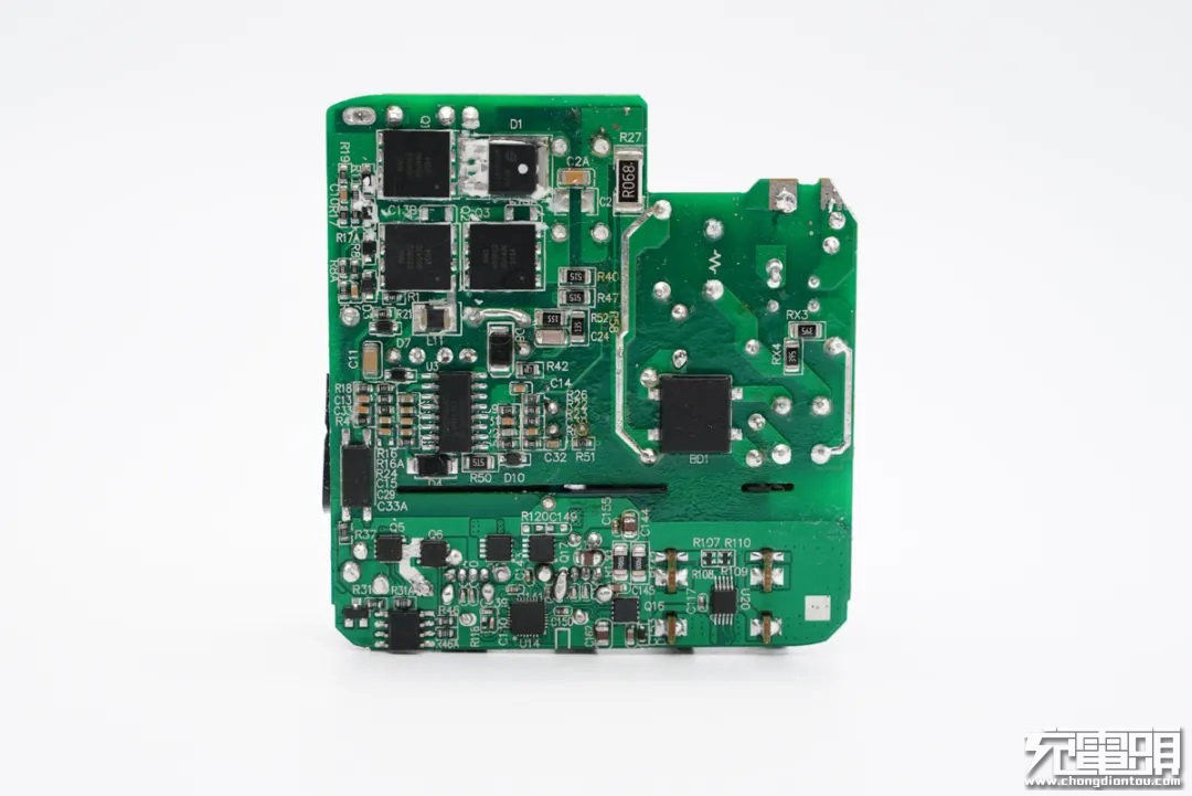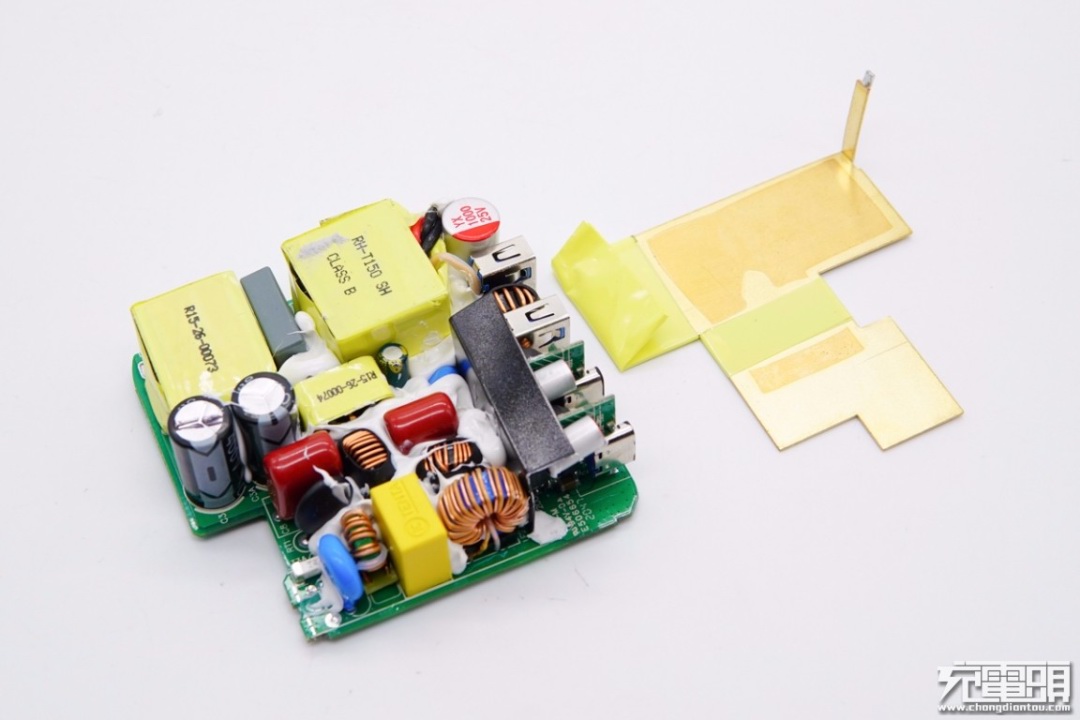 麦多多100W充电器PCB板上元器件布局紧凑有序,初次级之间设有塑料隔离板,正背面设有大面积黄铜散热片,保证高功率充电状态下的散热性能。此外输入端采用昱光电解电容进行滤波,输出端设有二次滤波固态电容进行滤波,输出纯净。