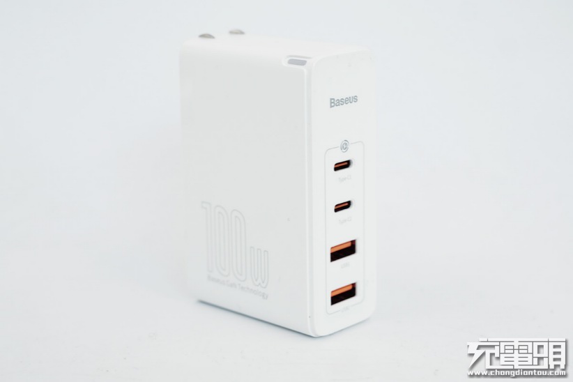 充电器的接口面板,上面是熟悉的‘Baseus’品牌Logo,下面依次排列着4个USB输出接口,分别是2个USB-C输出接口和2个USB-A输出接口。从上面的参数部分介绍可以得知,USB-C支持100W的输出功率,USB-A支持60W的输出功率。4个USB输出接口的内部胶芯均为橙色,也说明均支持快充输出。