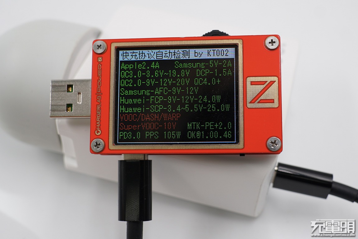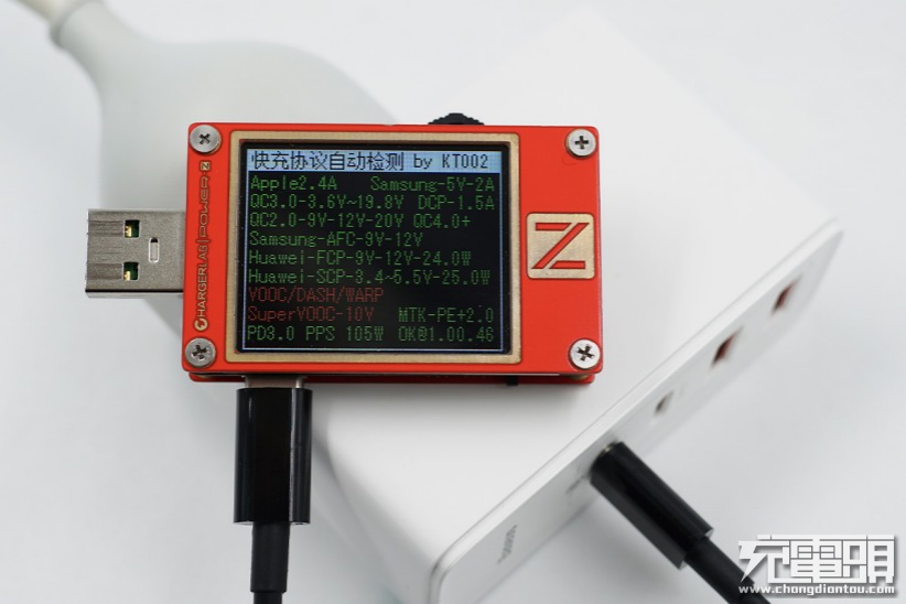 使用ChargerLAB POWER-Z KT002检测充电器USB-C1口输出协议,显示支持Apple 2.4A、Samsung 5V⎓2A、DCP协议,以及QC2.0/3.0、QC4.0+、AFC、FCP、SCP、PE2.0以及PD3.0快充协议。