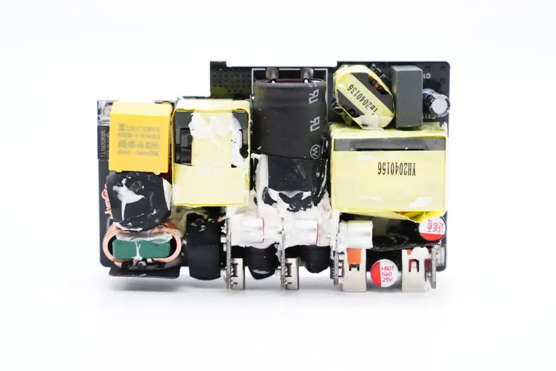 充电器PCB板上元器件布局整齐有序,为应对大功率输出带来的发热问题,元器件打胶以及配备大面积黄铜散热片,氮化镓功率芯片还额外配有导热垫。次级侧三路输出电路均配有二次滤波固态电容以保证输出纯净。充电器内部细节讲究,整体做工扎实。