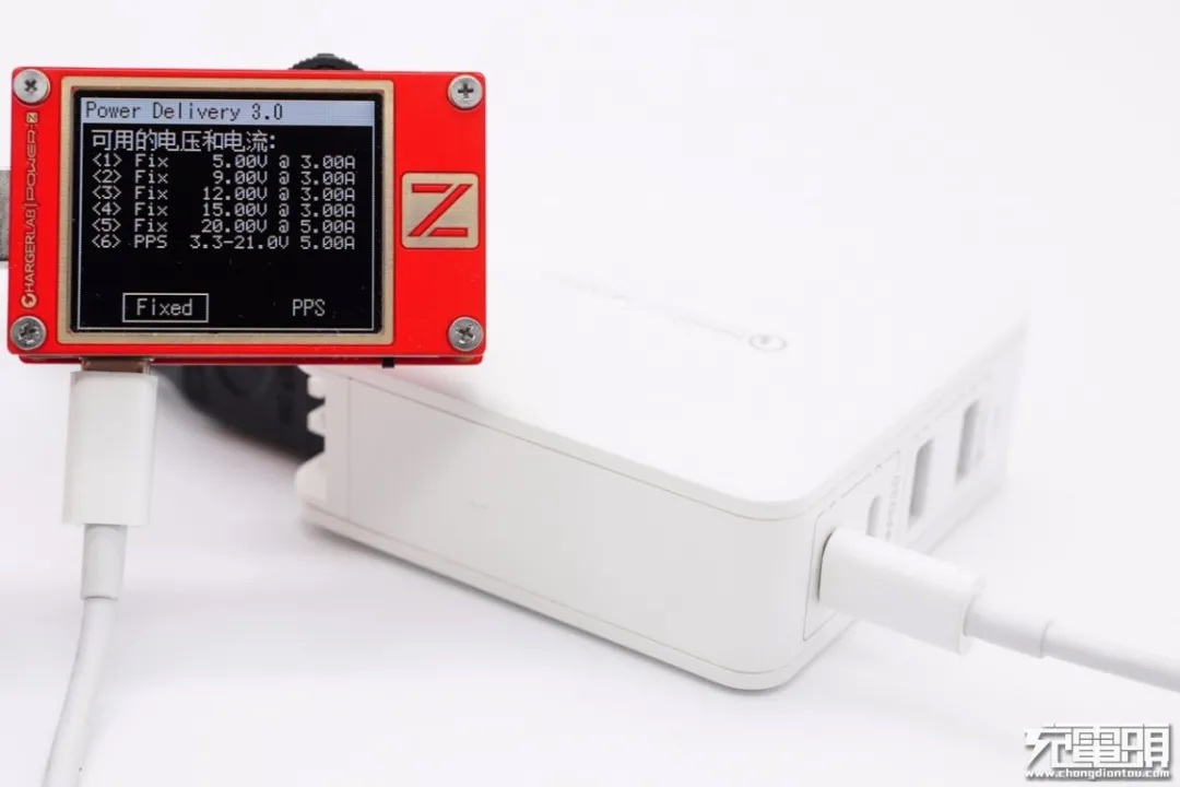 使用ChargerLAB POWER-Z KT002读取充电器USB-C2 PDO报文,显示USB-C2口除了5V⎓3A、9V⎓3A、12V⎓3A、15V⎓3A、20V⎓5A五组固定电压档位,还有3.3-11V 4.05A一个PPS电压档位,可以对需求PPS充电的设备提供很好的快充服务。