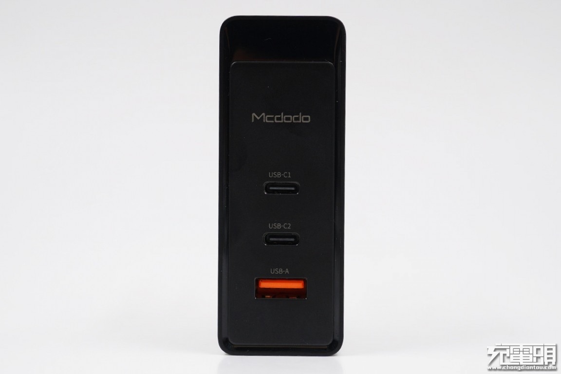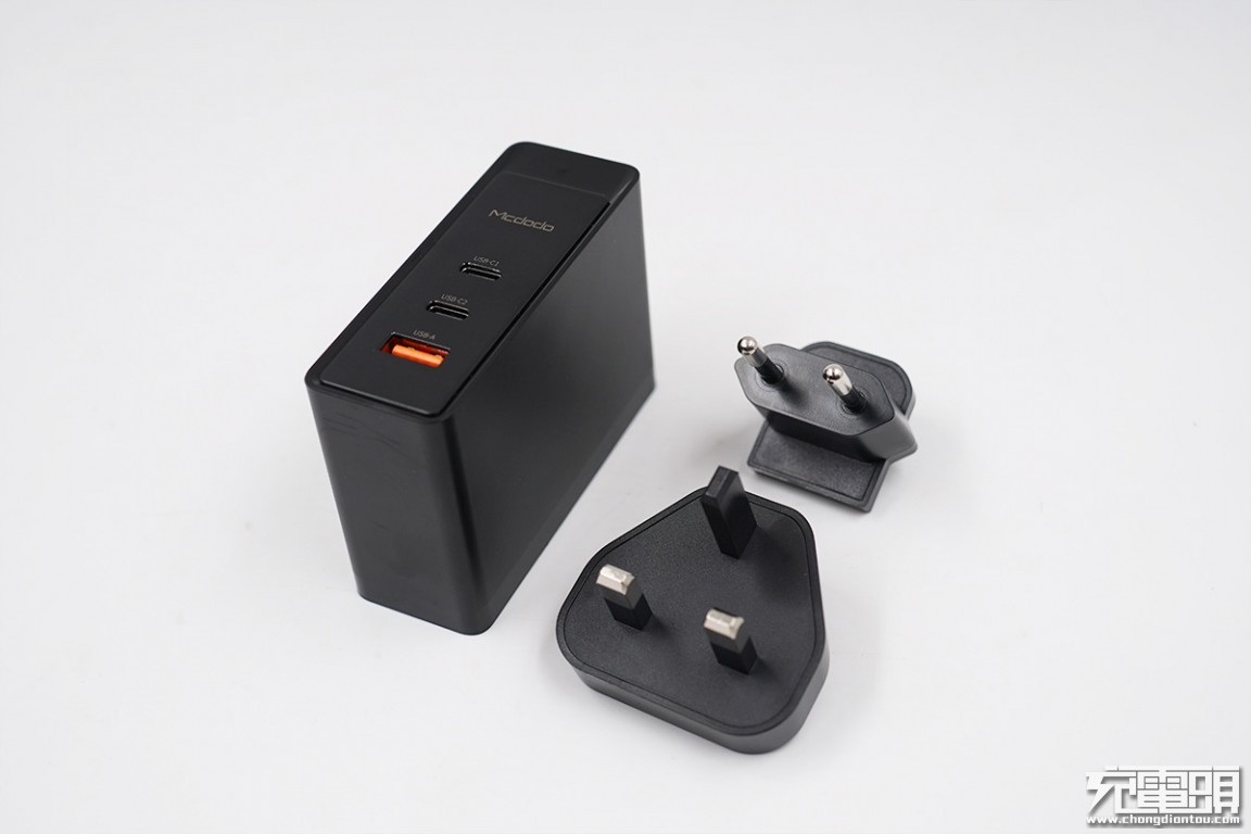 麦多多100W 2C1A氮化镓充电器,整体纯黑,偶有点缀金色“100WGAN”字样。Mcdodo logo与三个接口排成一线,秩序井然。两个USB-C接口舌片为黑色,USB-A接口则为橙色。可折叠插脚,方便旅行收纳,减少剐蹭,更是为了两个转换插脚特殊设计。性能方面,USB-C1/USB-C2最大输出100W,各个接口兼容协议几乎囊括了市面上的主流快充协议,三个接口的搭配足以满足绝大多数人的需求,非常方便,三口同时输出总功率也有100W左右。