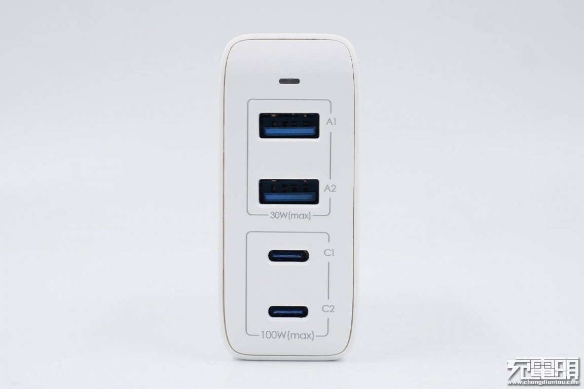 接口面可以看到指示灯与四个接口连成一线。四个接口分别是两个USB-C和两个USB-A接口,两两由指示框标识。USB-C1+USB-C2最大输出100W,USB-A1+USBA2最大输出30W。四个接口的搭配足以满足绝大多数人的需求,非常方便。