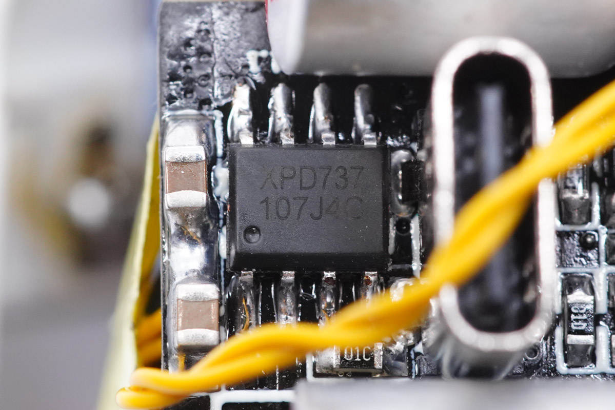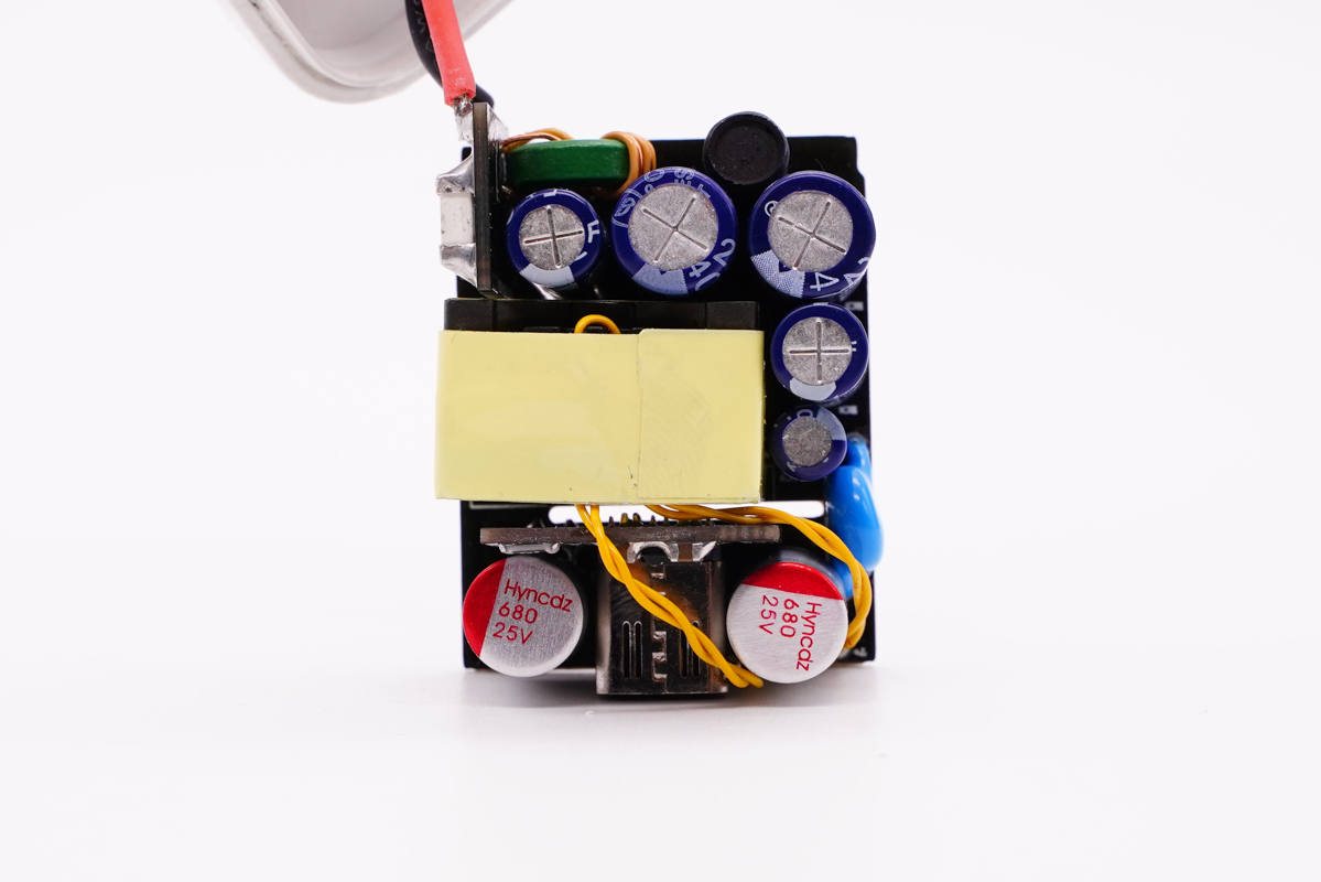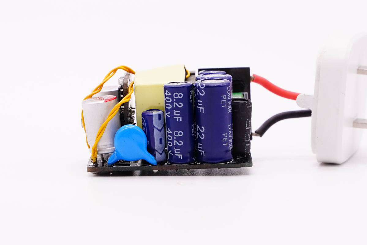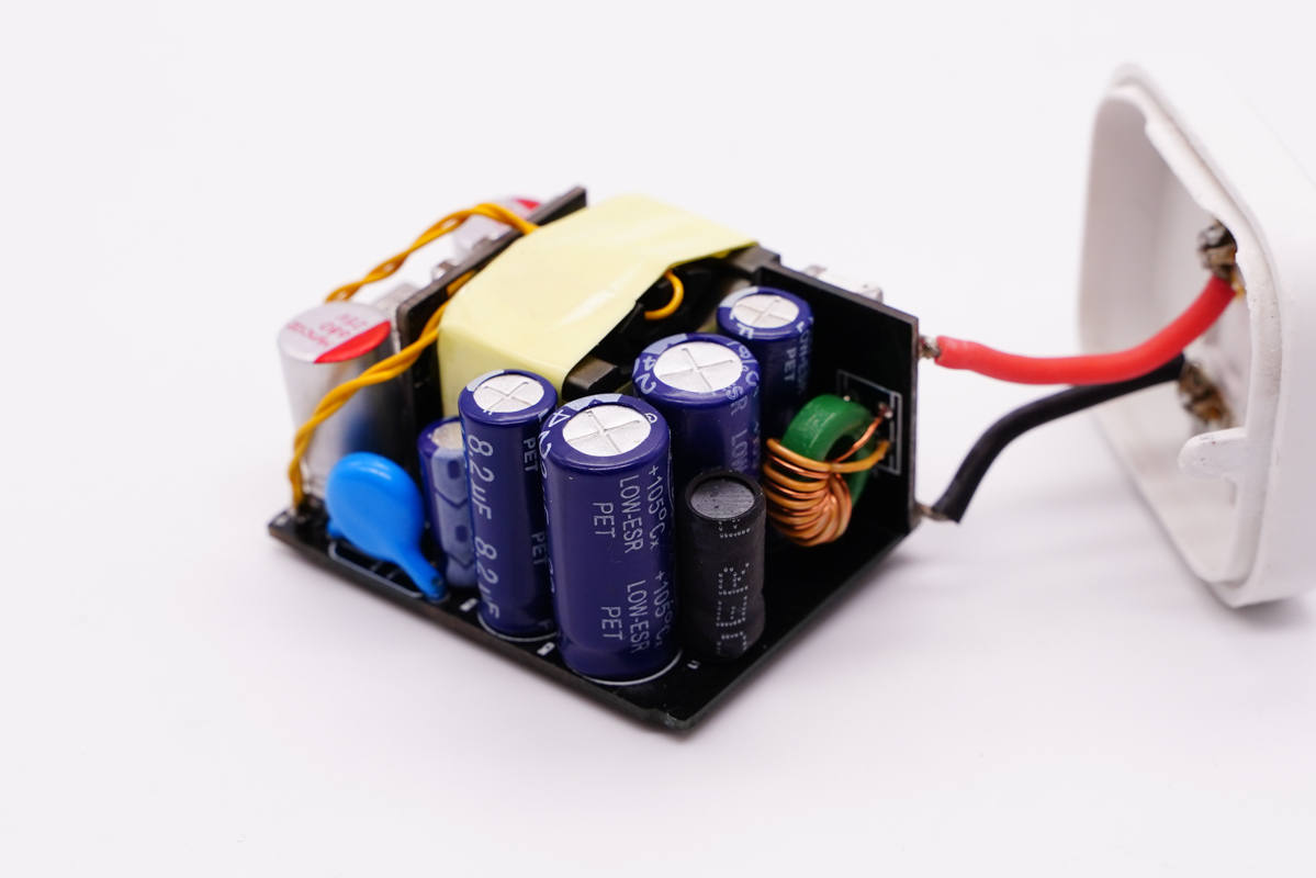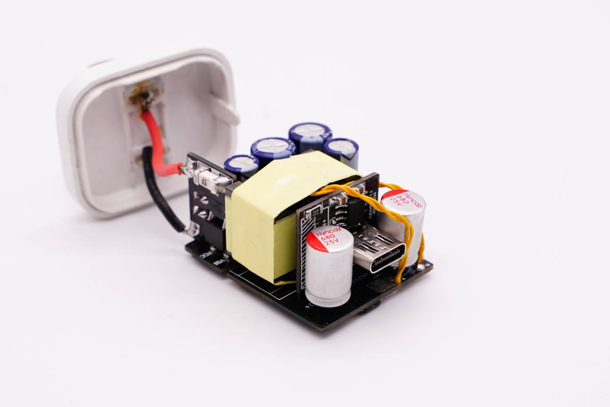 变压器输出采用多层绝缘线,输出USB-C母座焊接在小板上再焊接到充电器电路板上。输出采用两颗固态电容滤波。