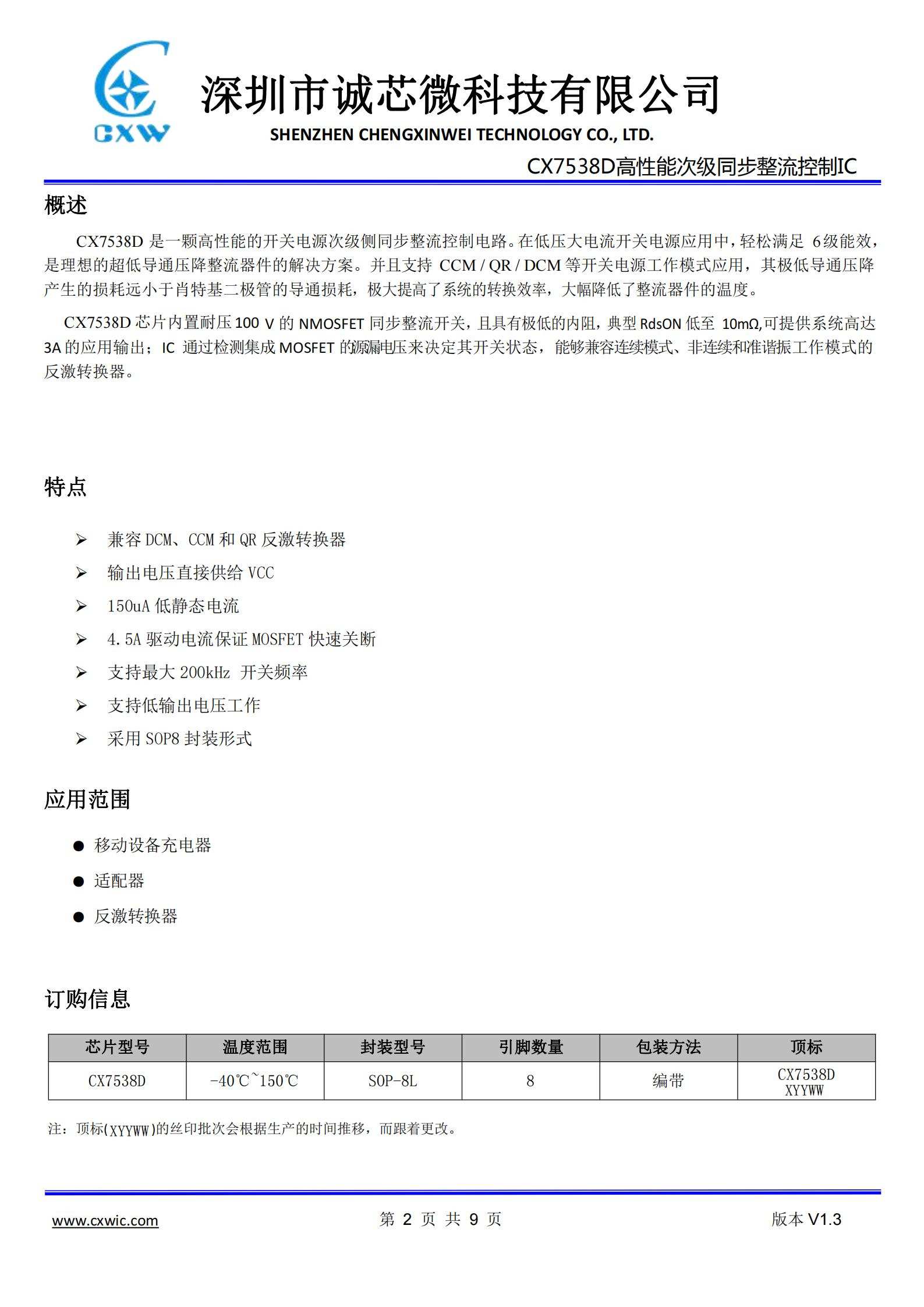 诚芯微CX7538D支持5V3A、9V3A、12V3A、15V3A、20V3A输出,外围元件非常精简,电压支持范围宽,适用于60W以下的适配器应用,轻松满足6级能效要求。