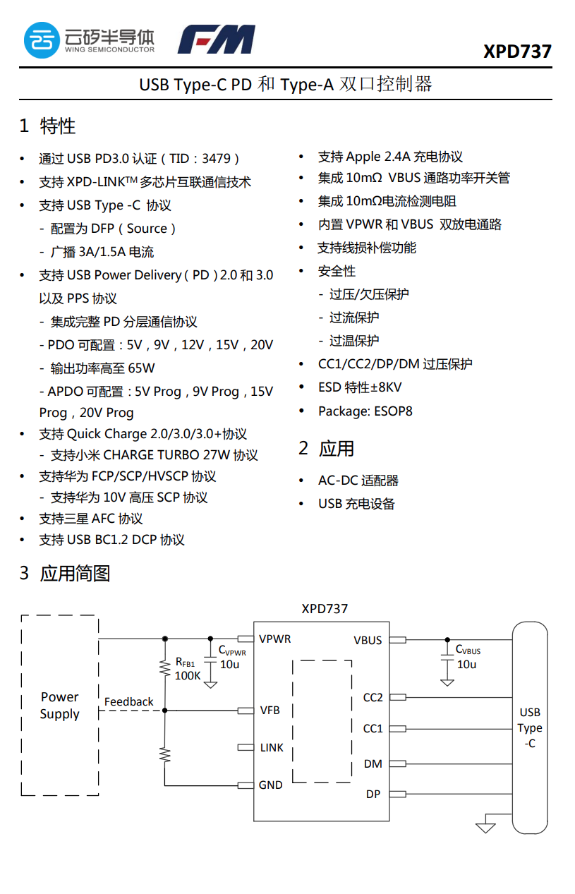 富满云矽XPD737采用ESOP8封装,内部集成 10mΩ VBUS 通路功率开关管,并且集成10mΩ电流检测电阻,支持USB PD以及PPS,QC3.0/2.0协议,华为SCP/FCP快充协议,三星AFC快充协议,引脚支持过压保护,工业级8KV ESD特性,适用于PD快充和移动电源,车充等应用。XPD737内置完善的保护功能,外围精简。