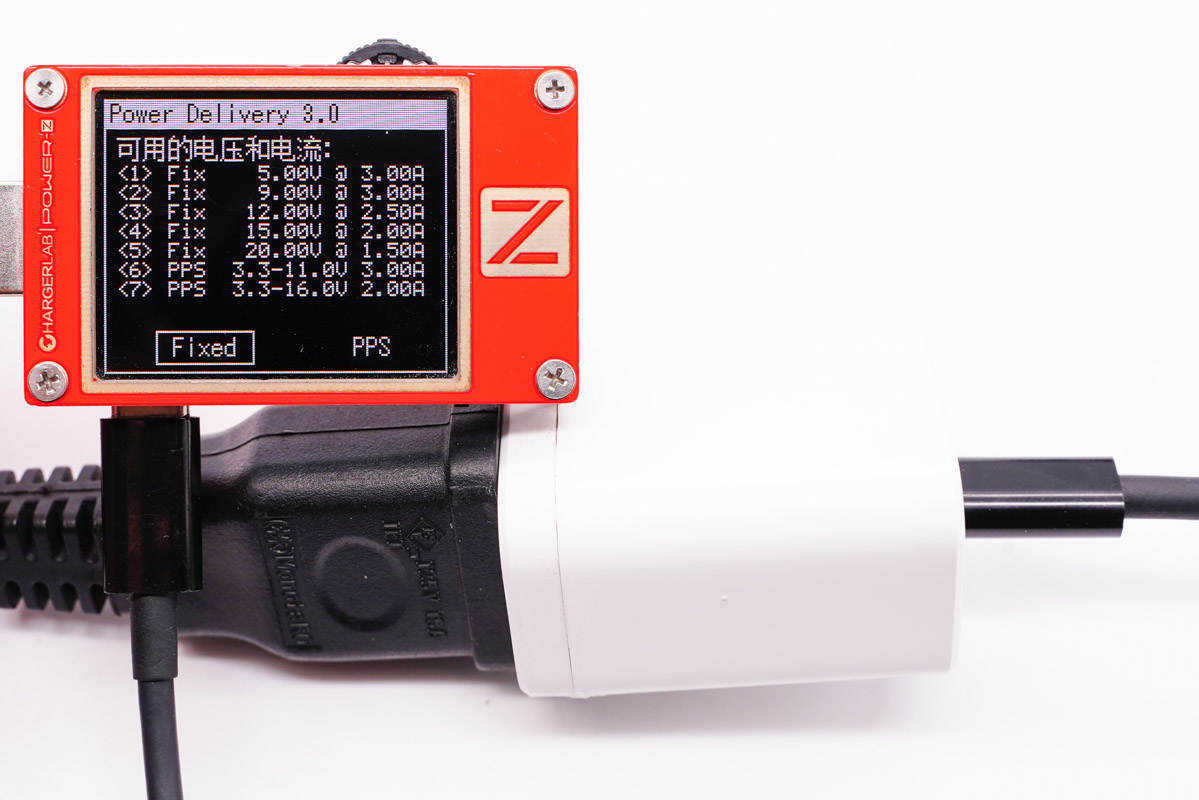 使用POWER-Z KT002读取充电器的PDO报文,实测支持5V3A、9V3A、12V2.5A、15V2A、20V1.5A五个固定PD输出档位,额外还支持3.3-11V3A和3.3-16V2A两组PPS档位。