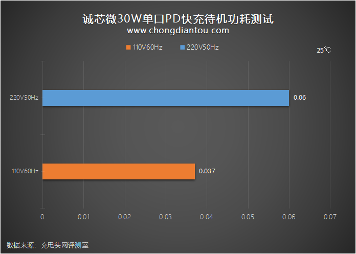 经过功率计测试,诚芯微30W PD充电器在220V 50Hz的空载功耗为0.06W,换算下来一年损耗的电能约为0.53KW·h,若市价电为0.6元/KW·h,则充电器一年的空载功耗约为0.32元左右。