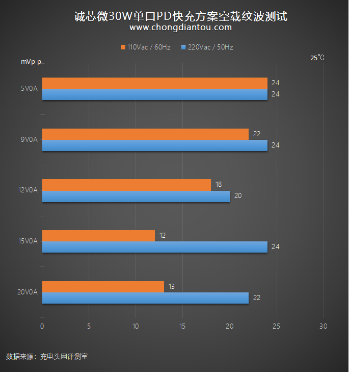 首先我们进行空载纹波测试,诚芯微这款30W方案空载纹波最高为24mV。