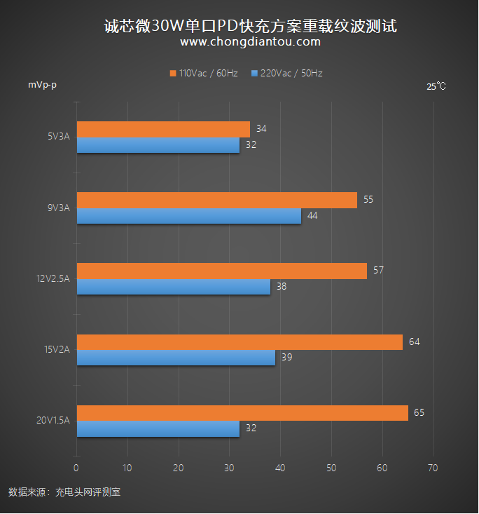 诚芯微这款30W单口PD方案在220Vac输入下纹波非常低,最高仅44mV,最高纹波出现在110Vac输入20V1.5A输出下,为65mV。