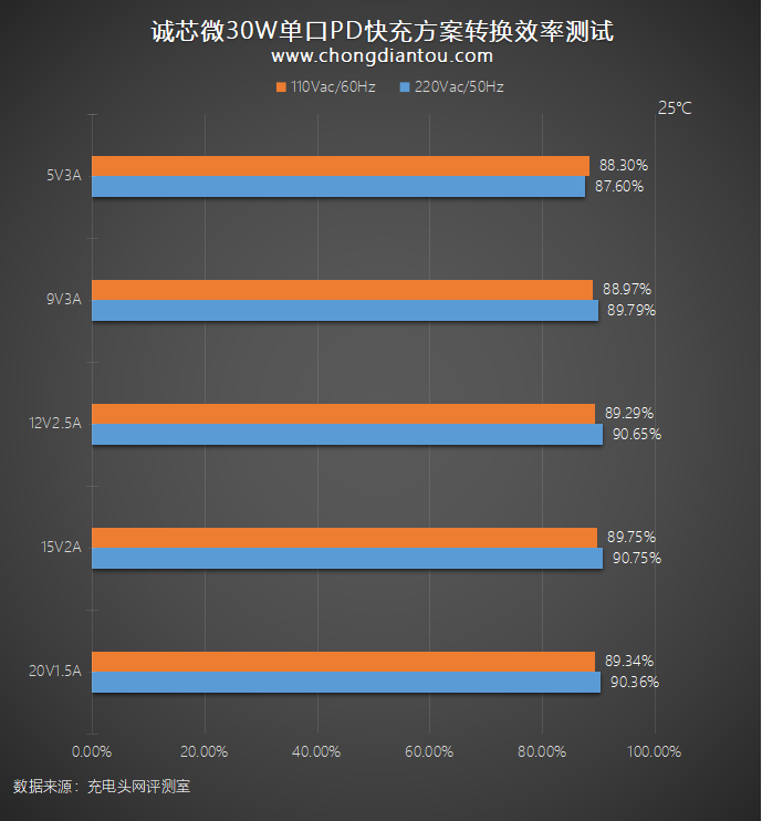 我们通过110Vac/60Hz和220Vac/50Hz模拟110V和220V环境,将诚芯微30W快充方案在各个电压档位进行满载测试,实测220V下这款方案的转换效率超过了90%,110V下效率也接近了90%,