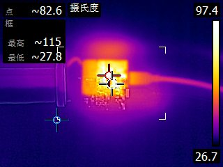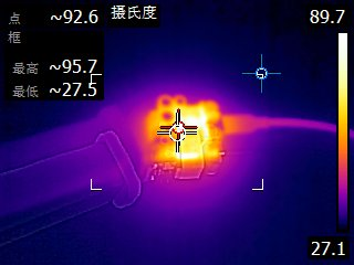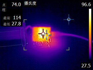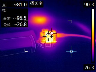充电头网对诚芯微30W单口PD快充方案进行温升测试,在25℃恒温箱中以9V3A和20V1.5A持续输出一小时,测试温升数据。采用FLIR E4红外热像仪进行温度测试。