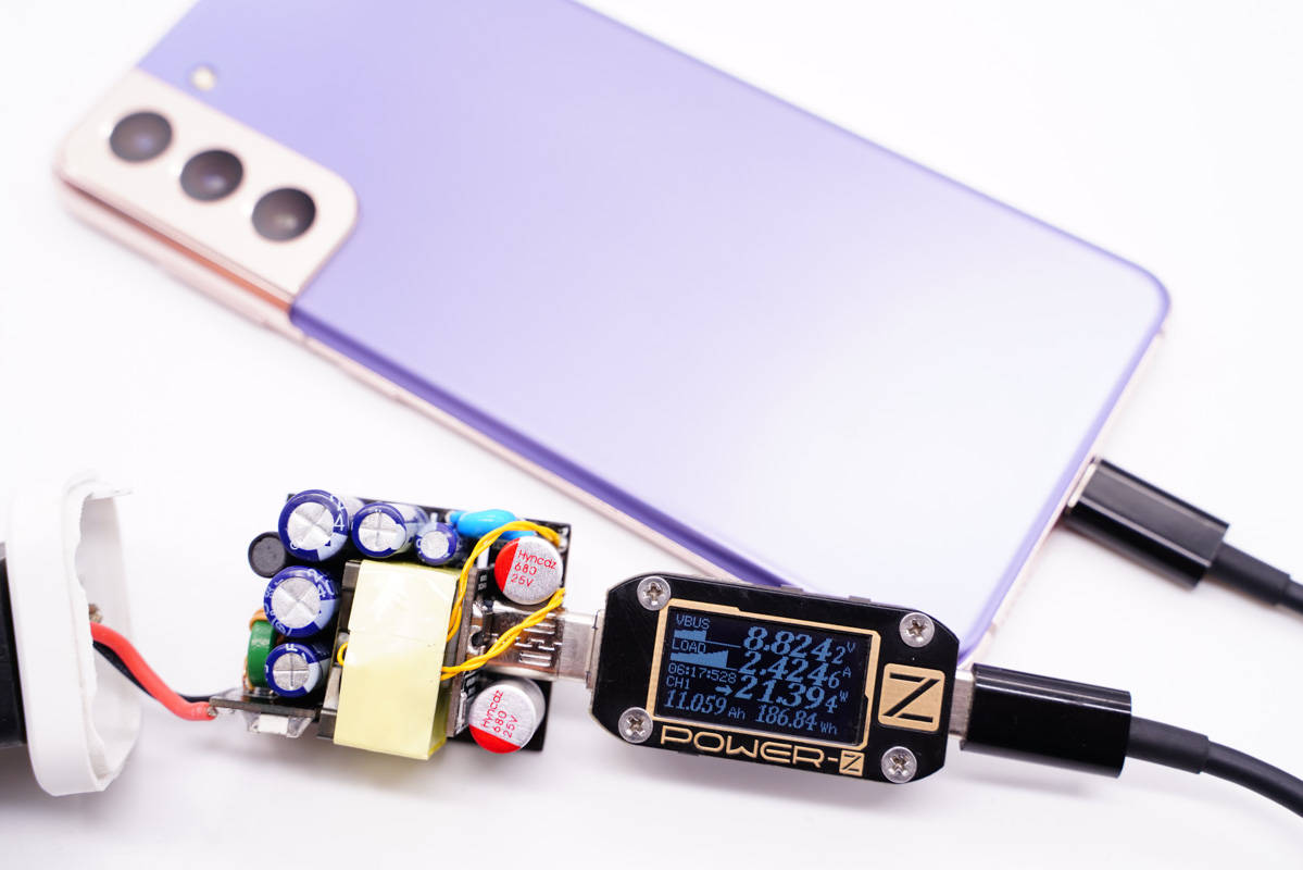 为三星S21充电,电压8.82V,电流2.42A,充电功率约为21.4W。