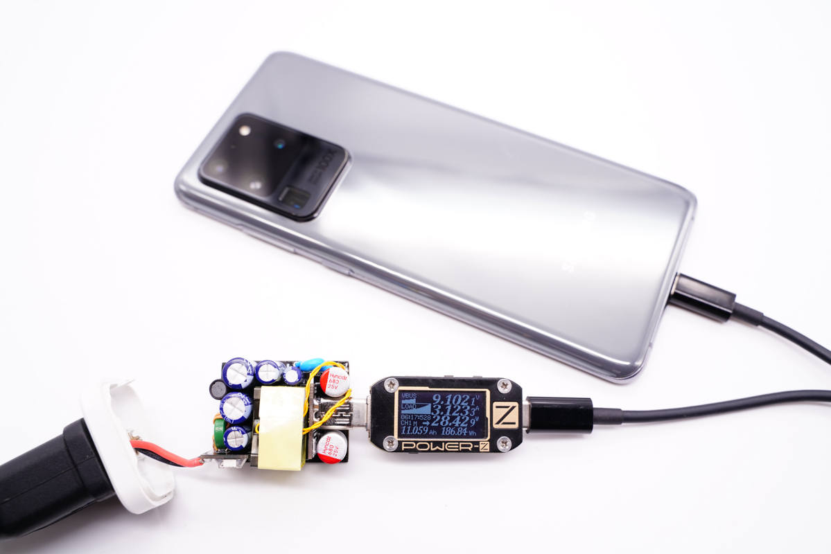 为三星S20U充电,电压9.1V,电流3.12A,充电功率约为28.43W。