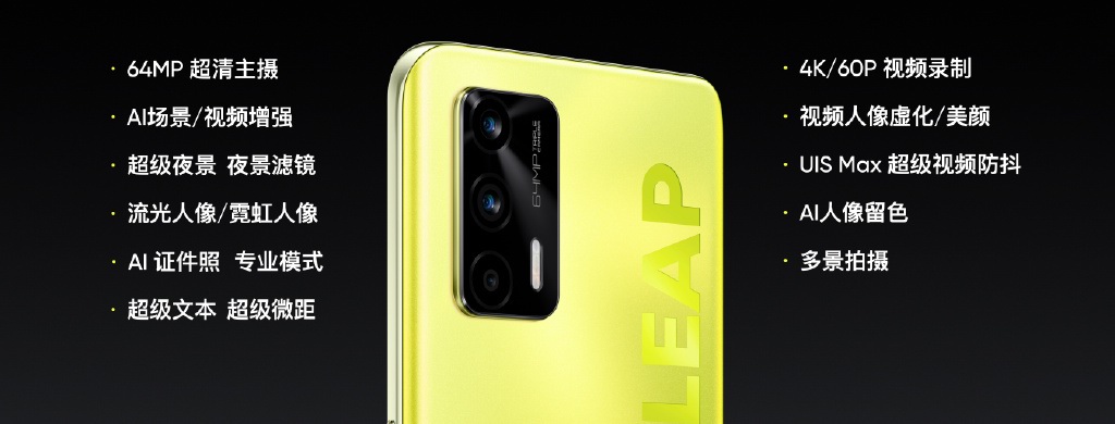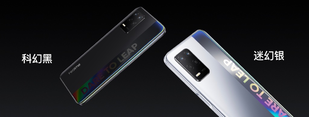 另一款是中杯产品realme Q3,采用纳米级全息纹理设计,DREA TO LEAP标语不同角度下观看营造出变幻多彩幻彩色,共有迷幻银、科幻黑两种配色可选。