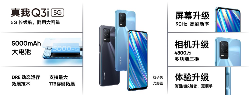 最后发布的是realme Q3i,采用7nm工艺的天玑700处理器,6.5英寸90Hz高刷屏入门机也进入高刷时代,4800W像素多功能三摄配置,5000mAh大容量电池支持18W快充,双5G sim + 1SD存储卡共三卡槽设计。