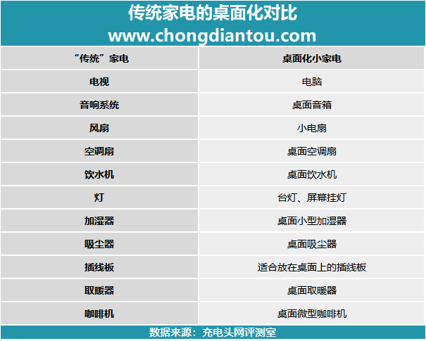 除了上面聊到产品之外,我们还选择了一些代表性的家用电器进行对比,可看到“传统”家电往桌面小家电路子走的还真不少。仔细看看,小编的桌面上就有不少,电脑自不必多说,还有屏幕挂灯,小电扇、小型加湿器、桌面吸尘器,到了冬天,桌面取暖器也少不了。