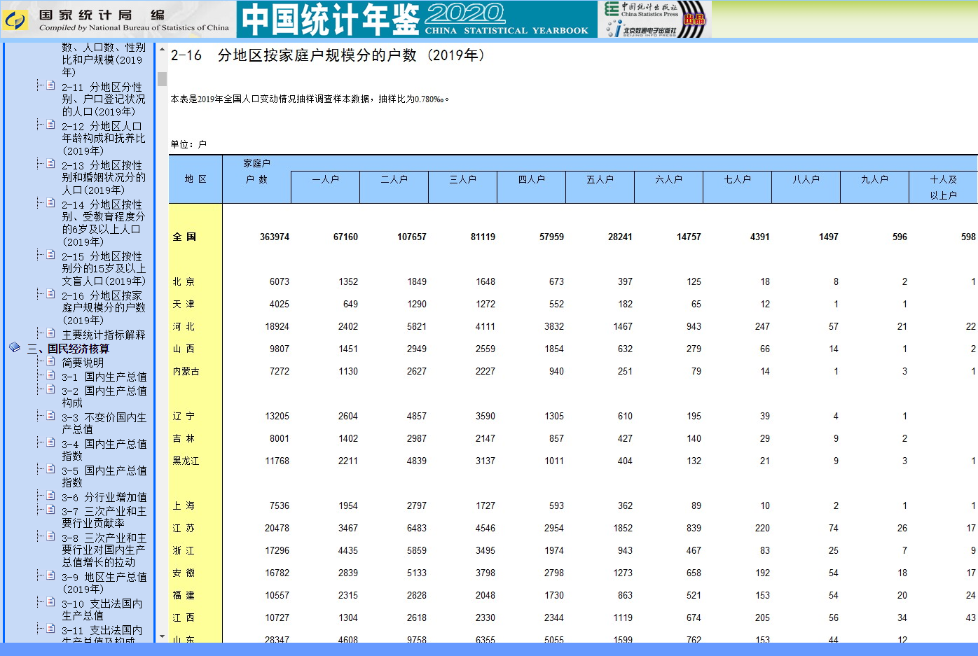 翻看中国统计年鉴,可以看到“一人户”的数量仅次于“二人户”和“三人户”,在363974的户数样本中,占比达到五分之一左右。看来之前大家热议的“中国的独居成年人口已经超过7700万”并非虚言。