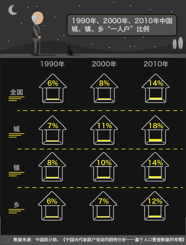 再看看大趋势,三十年来,全国的独居人口已从1990年的6%上升到2010年的14%,中国“一人户”家庭数量明显上升。人口迁徙,跨城工作,多代家庭减少,城市化发展等都成为独居人数翻倍的原因。