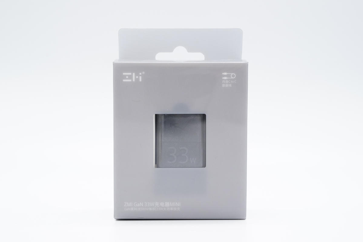 产品采用塑料外包装盒,整体为灰色,顶部带有挂钩设计,正面中心透明处理,可以观察充电器实体。此外正面上方印有ZMI logo以及CC数据线标识,下方印有充电器名称。