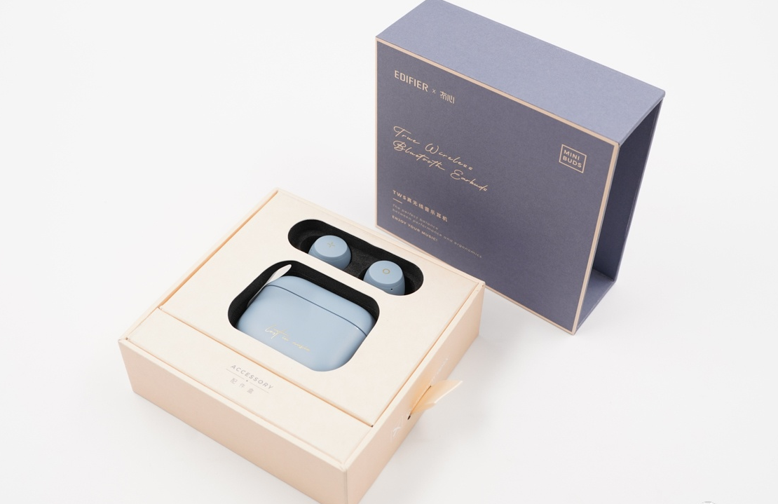 EDIFIER x 冇心 MINI Buds,那会儿小编正在搜肠刮肚研究给朋友送什么礼物。第一感觉是耳机包装盒精致,配色似乎也比较高级,像个礼品盒。再加上花里胡哨的艺术字体,猫耳抽屉式的开合方式,打开就很有仪式感呀。