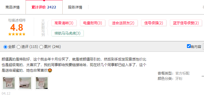 通过电商平台我们可以看到这款耳机评分约为4.8分,口碑不错。2000多条评论中赞誉居多,“适合送朋友”、“高音清晰”等频繁出现。“电量耐用”和“续航马马虎虎”这俩同时出现也挺有意思的,反映出消费者对续航的期待不同。