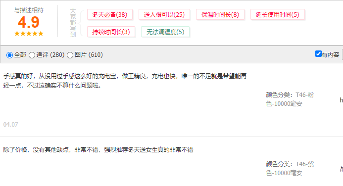 知暖充电宝目前在天猫冇心旗舰店中的销量约为48504,评论数有11000多条,评分达到惊人的4.9。其中“冬天必备”、“送人很可以”这样的评论堪称精准;“无法调温度”的原因温度变化温和,感知不强。