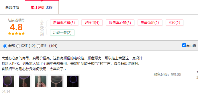 看看销量,夏天还没到来就已经有超过1200把了,评论也有三百多条,产品评分为4.8。看到的第一条评论便是“大爱”,看来大家对电蚊拍的颜值需求也很有市场。