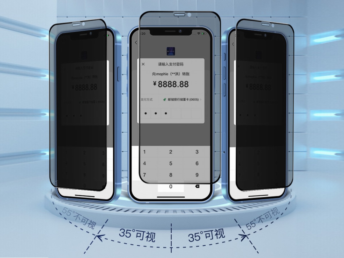 mophie防窥保护膜在保护膜的基础上,加入了防窥技术,通过类似百叶窗的竖立格栅层让光线只能垂直穿透,形成了左右各35度可视范围,用户在正面可以清晰观看自己手机屏幕内容,而侧边的人看手机屏幕是黑色的,保护用户在输入密码、银行卡账号、聊天记录等隐私信息不外泄。