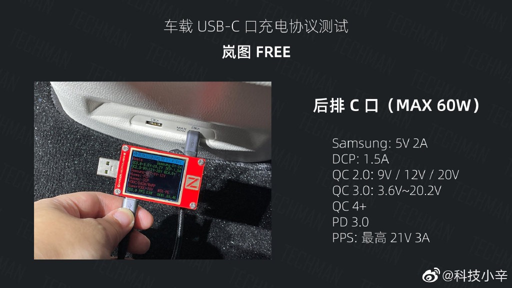 隶属于东风汽车旗下的岚图FREE后排也带有USB-C充电接口,基于USB PD标准开发,支持PD3.0标准,最大输出功率60W,带有21V3A PPS电压子集,并支持常见的QC3.0、QC2.0快充协议。