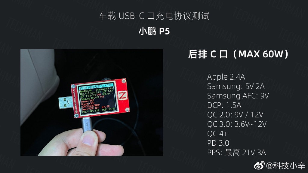 最后是小鹏P5,后排接口也带有USB-C充电接口,基于USB PD标准开发,支持PD3.0标准,最大输出功率60W,带有21V3A PPS电压子集,并支持常见的QC3.0、QC2.0、AFC、APPLE2.4A快充协议。