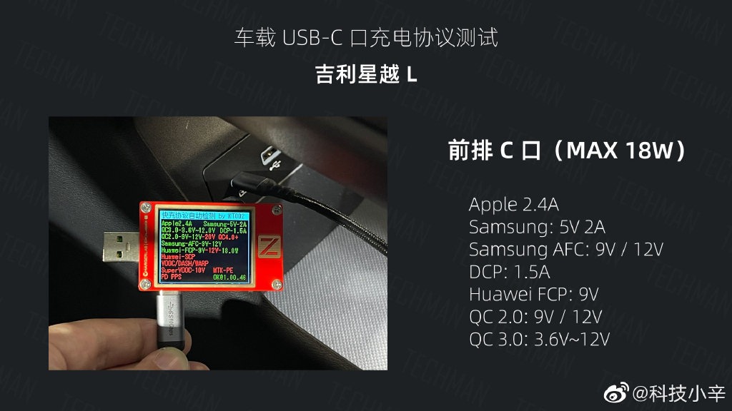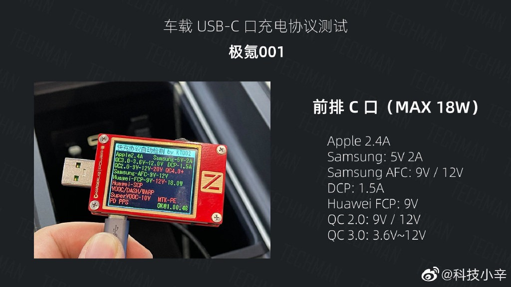 下面来看看吉利旗下的高端新能源汽车品牌极氪,极氪001前排也带有一个USB-C充电接口,与吉利星越L采用相同的处理手法,该接口为USB2.0定义,没CC线芯不支持PD快充。但支持APPLE2.4A、QC2.0、QC3.0、AFC、FCP等常见的快充协议,快充功率支持到18W。