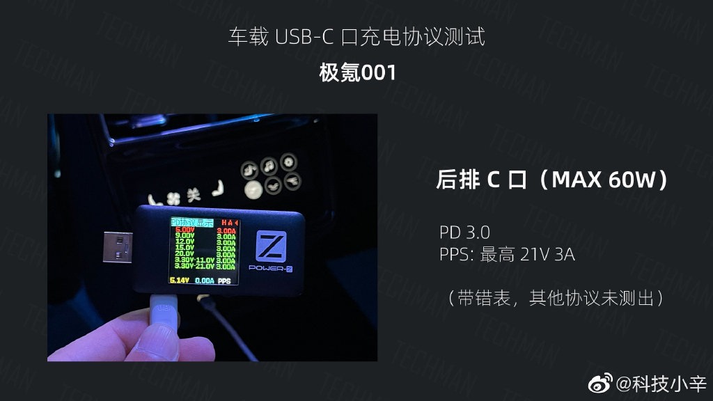 后排接口方面,极氪001后排带有一个USB-C充电接口,基于USB PD标准开发,支持PD3.0标准,最大输出功率60W。读取PDO信息可以看到带有5V3A / 9V3A / 12V3A / 15V3A / 20V3A五个固定电压档,并包含3.3-11V3A / 3.3-21V3A两组PPS电压子集。