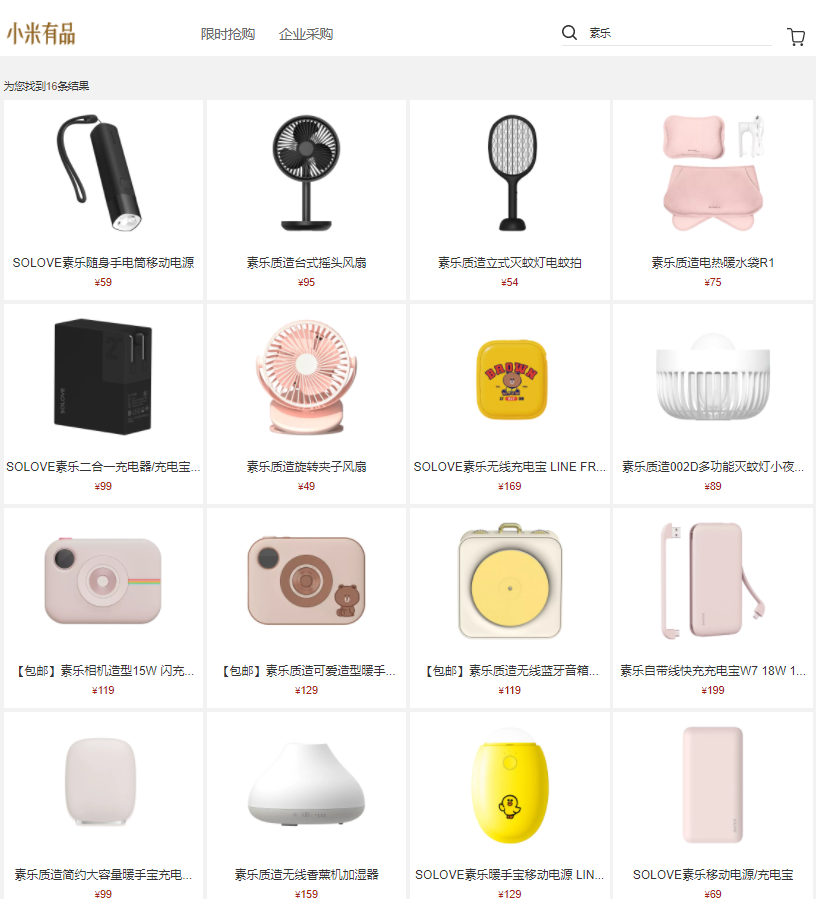 前面我们有提到素乐和小米的合作,作为消费者感知最明显的是可以在有品商城中看到大量的素乐产品。