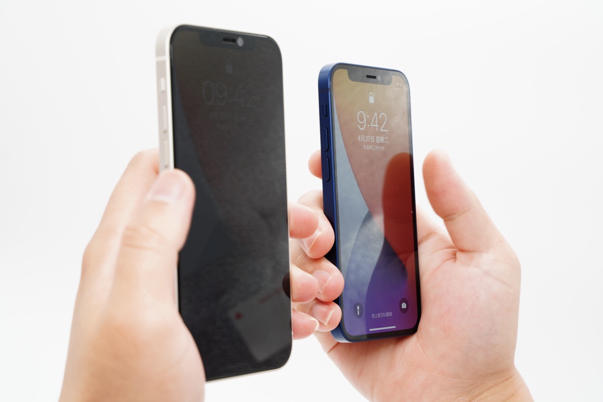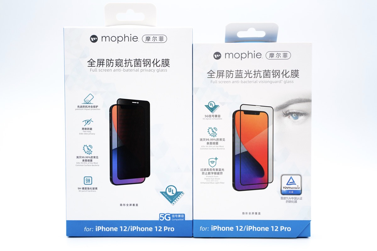 这是mophie为iPhone 12推出的钢化膜产品系列中的两款,分别是mophie全屏防窥抗菌钢化膜和mophie全屏防蓝光抗菌钢化膜。但今天要介绍的主角是左侧这款,也就是mophie全屏防窥抗菌钢化膜。