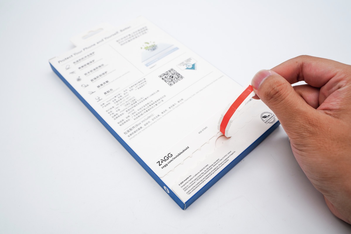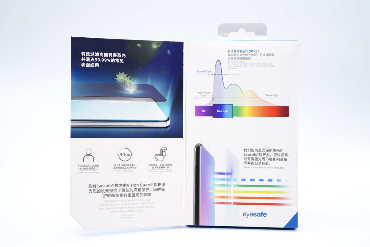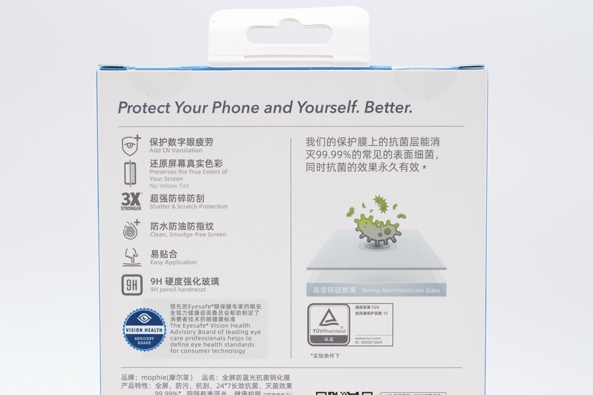 mophie在产品的包装盒上也精心的进行了设计,整个包装盒采用了折页的设计风格。翻开折页,两侧描述了mophie的这款钢化膜拥有除菌、防蓝光以及护眼的功能。而这些功能在目前看来也是非常有必要的,毕竟现在人们泡在手机上的时间都比较长。