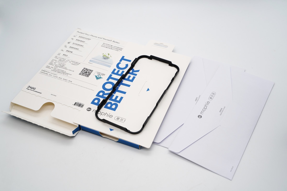 而且在贴膜的时候很多用户都会手抖,导致钢化膜贴歪,于是就需要重新贴,一来二去一张好好的钢化膜就浪费掉了。为了解决这个问题,mophie在钢化膜包装里面附带了固定框架,也就是俗称的“贴膜神器”,可以完美解决手抖的问题。在贴膜前只需要将固定框架套在手机上即可。