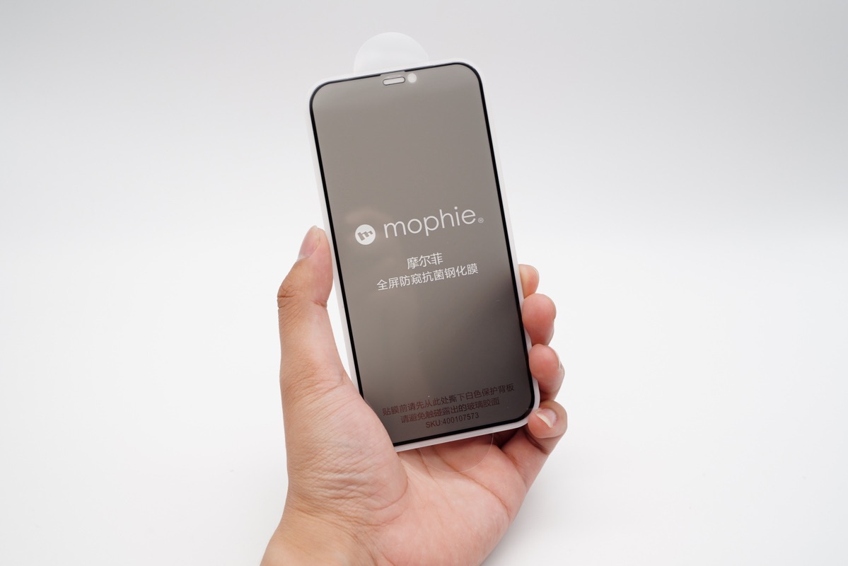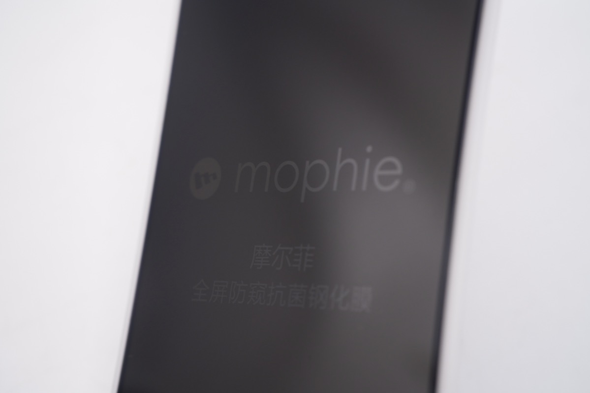 这是mophie全屏防窥抗菌钢化膜,全屏幕设计,顶部麦克风和前置摄像头的位置专门留出了孔位。