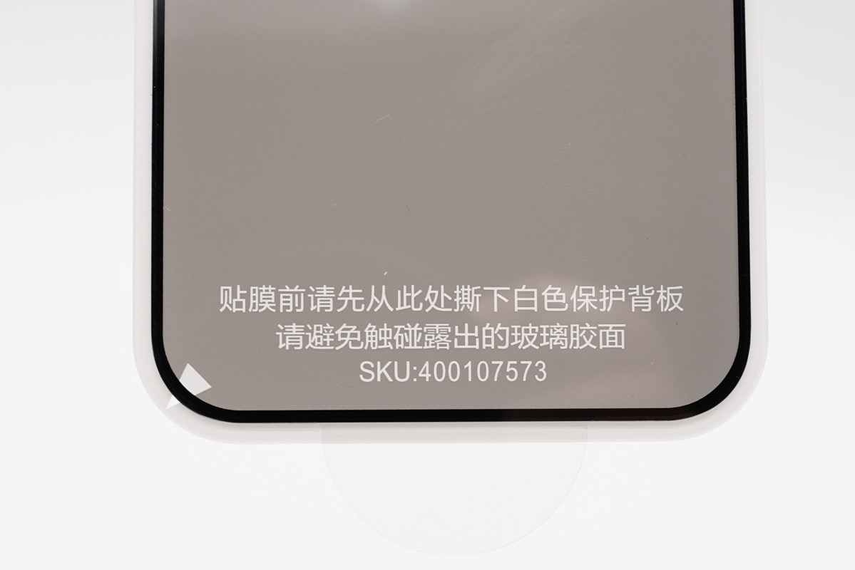 钢化膜的下面标注着“贴膜前请先从此处撕下白色保护背板,请避免触碰露出的玻璃胶面”。