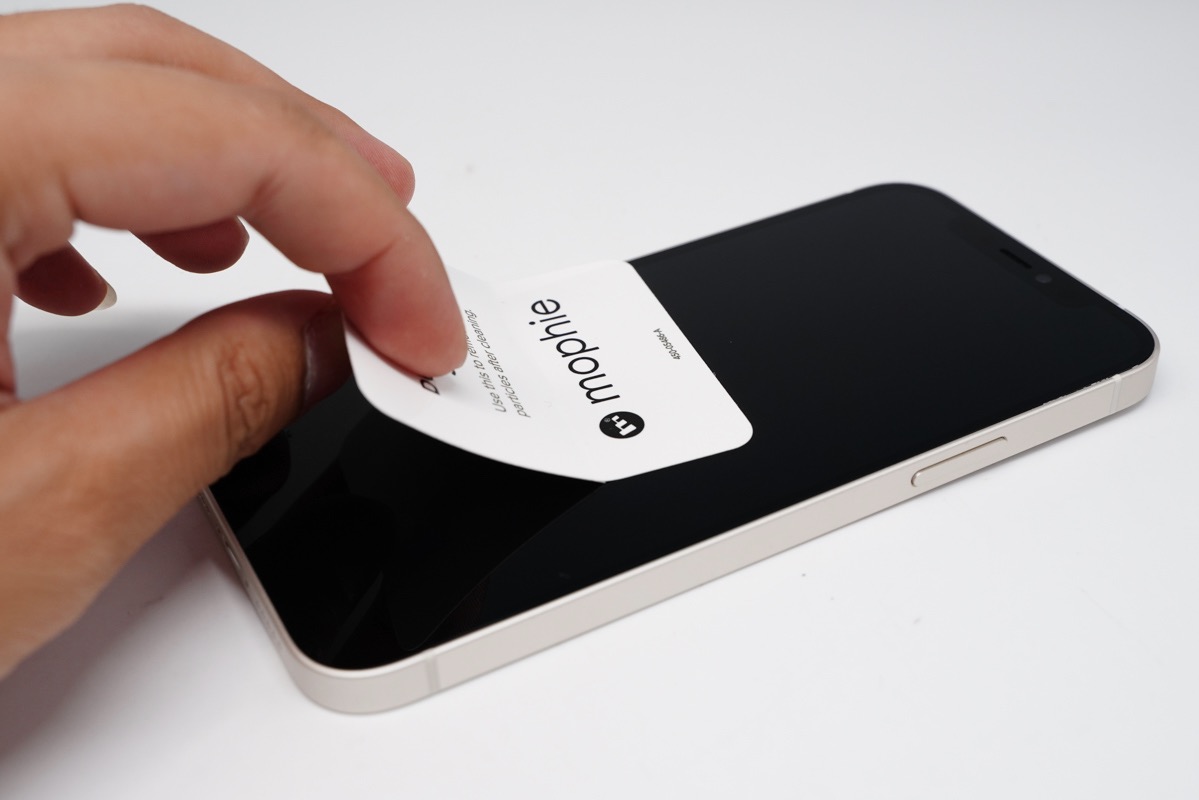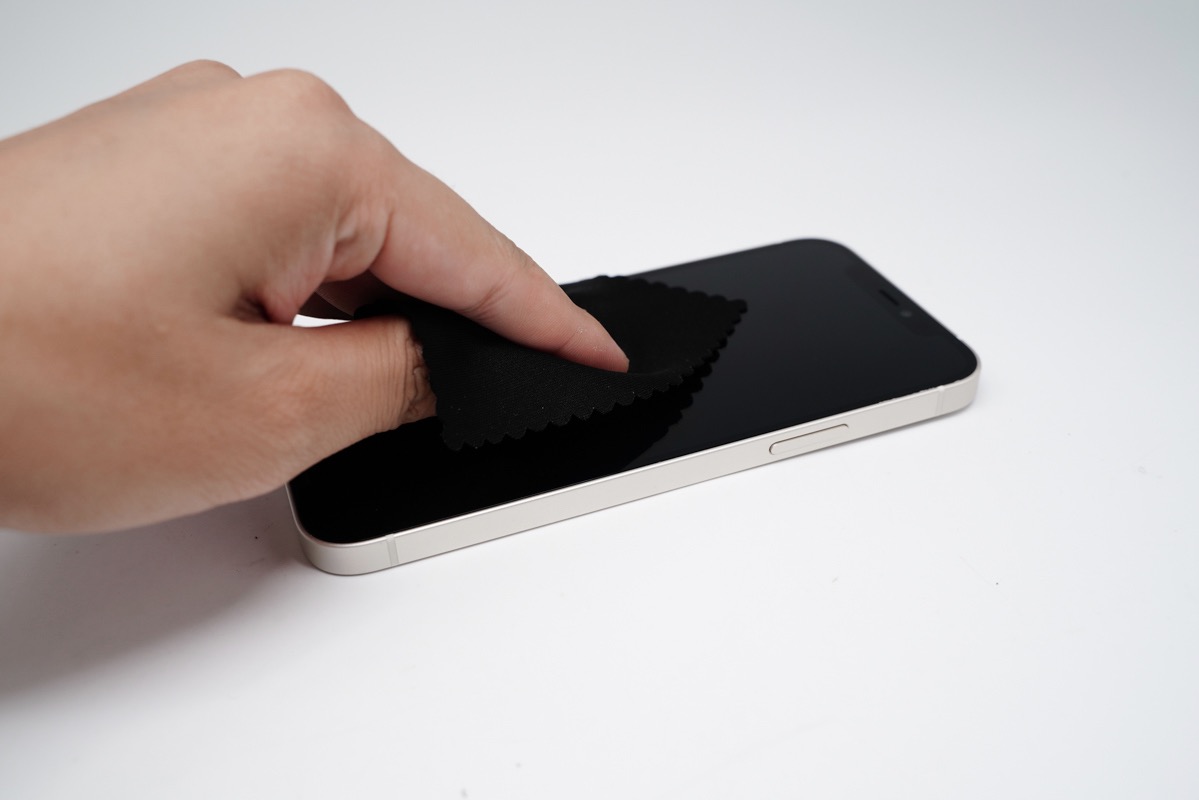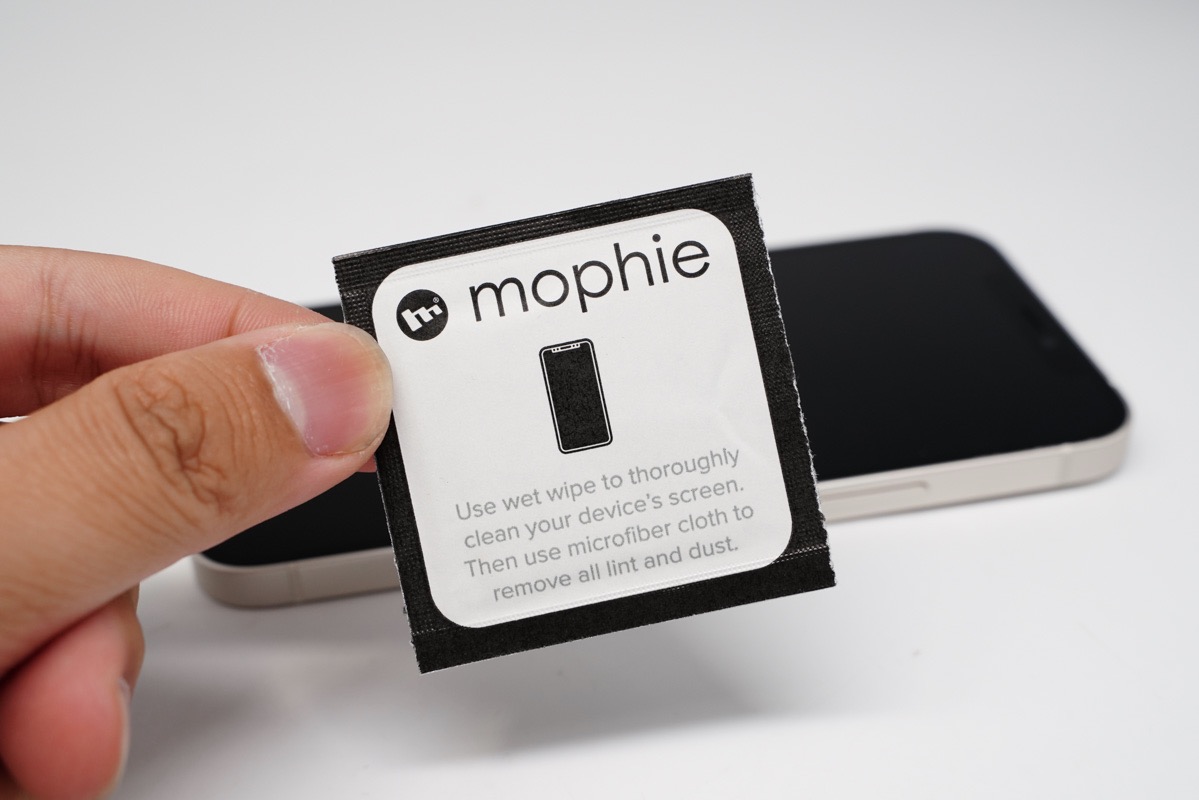 贴膜的操作相信大部分用户都很熟悉了,先用附带的mophie酒精擦纸将屏幕上的一些杂物擦除。