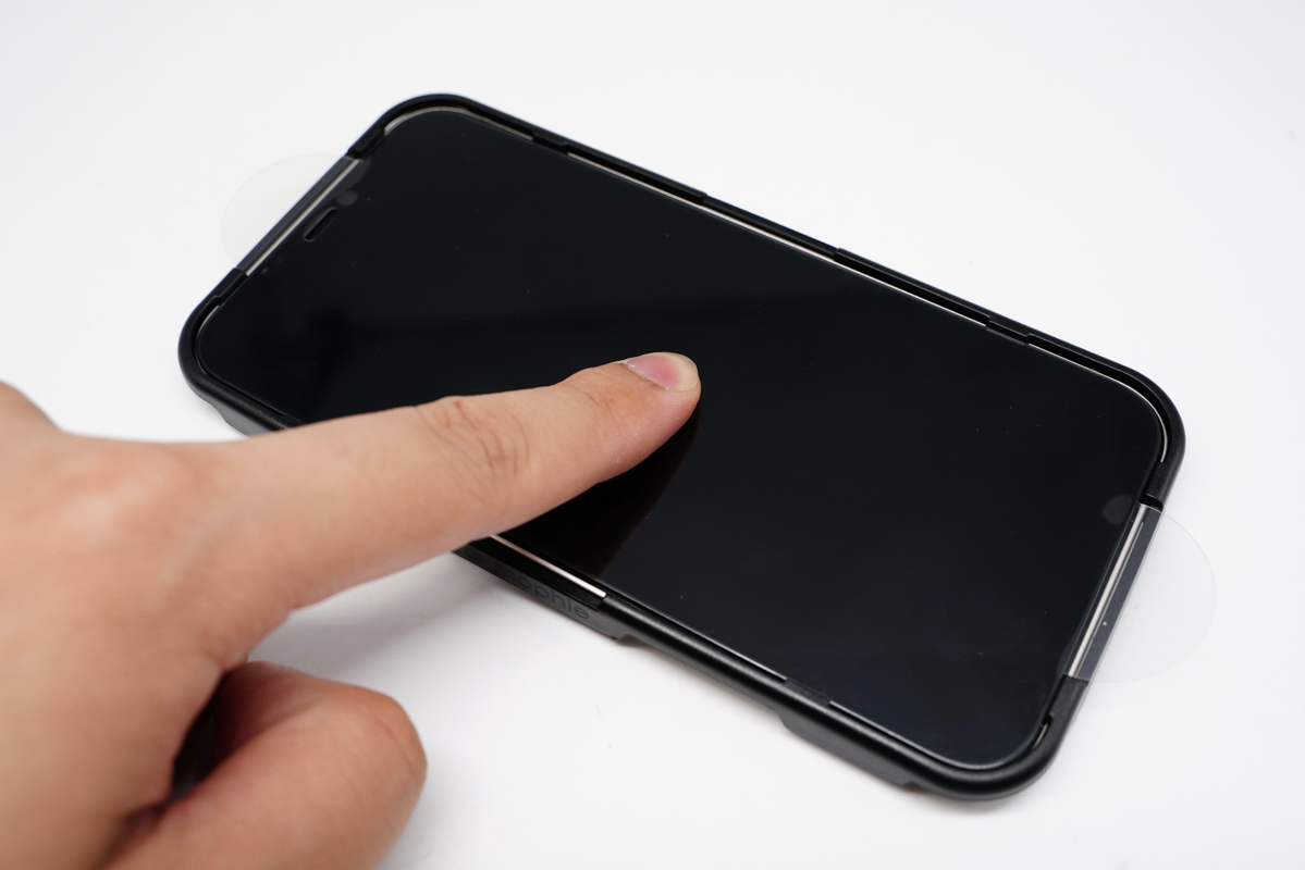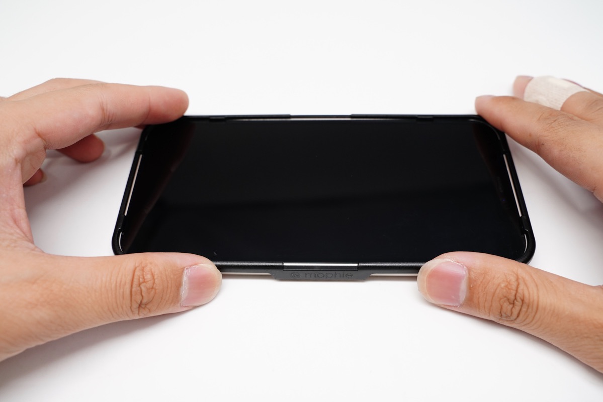 然后就可以直接将mophie全屏防窥抗菌钢化膜贴上了,因为有了固定框架的存在,所以整个贴膜过程很轻松,而且不会有错位的风险。