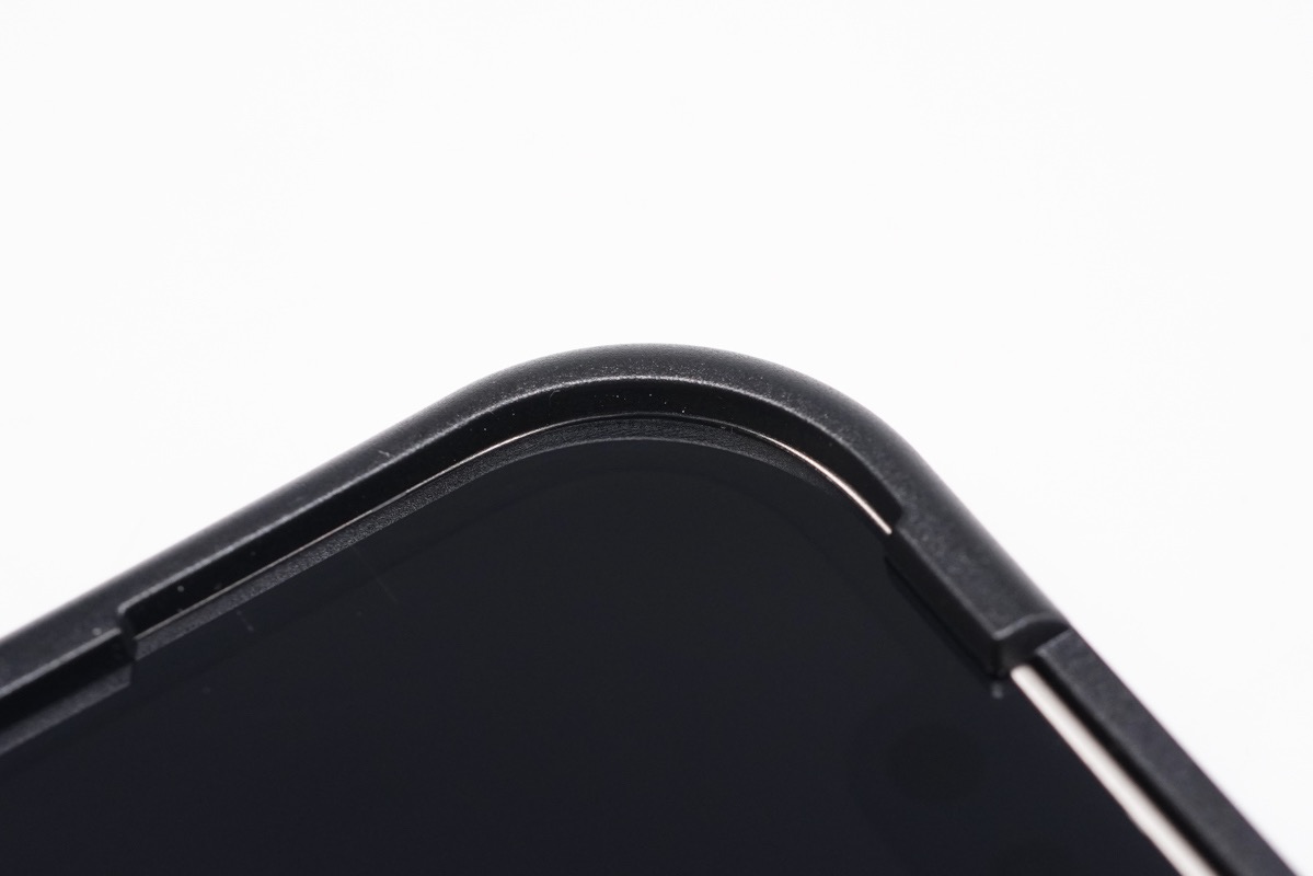套上固定框架的手机边角处特写,主体框架依附手机边框固定,突出的部分起到限制的作用,可以防止用户将钢化膜贴错位。