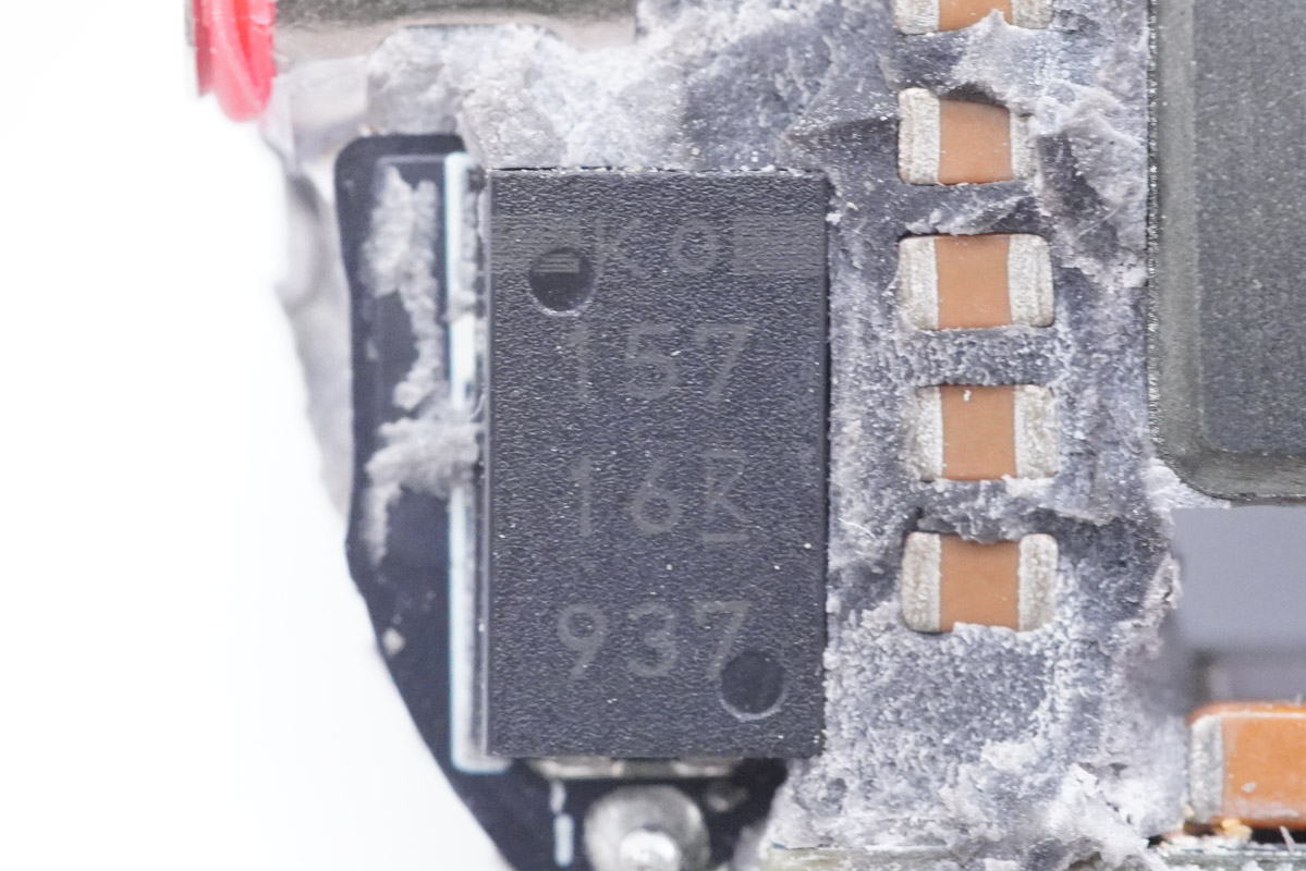Kemet基美的聚合物钽电容,规格为150μF 16V,用于输出滤波,这里也是为了减小体积,同时适合GaN适配器高开关频率的特点,一举两得。