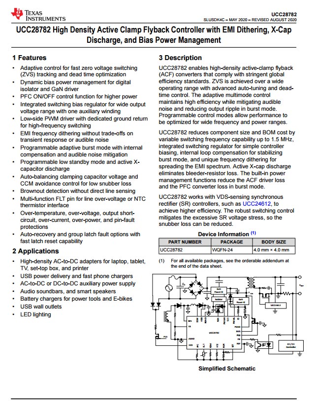 TI UCC28782高密度ACF控制器,支持频率抖动以降低EMI电磁干扰,内置X电容放电和偏置电源管理。